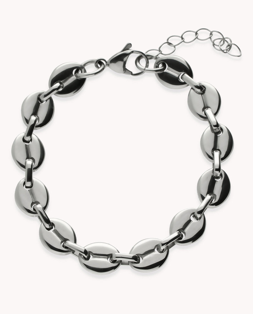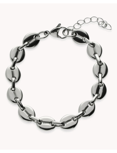 Pulsera de acero inoxidable con eslabón tipo calabrote de 9 mm de ancho, cierre de mosquetón y largo de 18 cms más 4 cms de alargador.