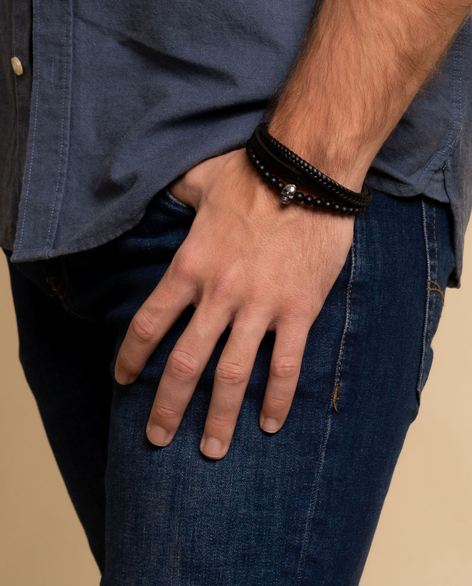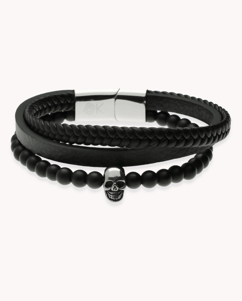Pulsera de acero inoxidable con tres tiras: dos de cuero negro (plano y trenzado) y una de piedras de Ágata negra de 6 mm de diámetro y motivo central de calavera, largo de 21 cms y cierre de imán.