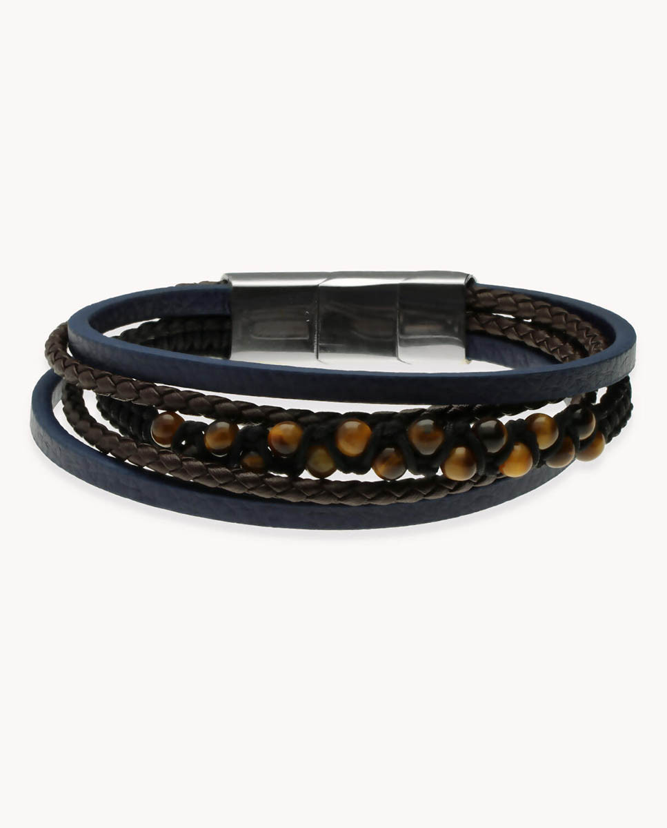 Pulsera de acero inoxidable con cuatro tiras de cuero en diferentes acabados y colores (azul y marrón) y una tira de macramé negro con piedras de Ojo de Tigre de 4 mm de diámetro, largo ajustable con pieza extraíble (19,5 cms y 21 cms) y cierre de imán.