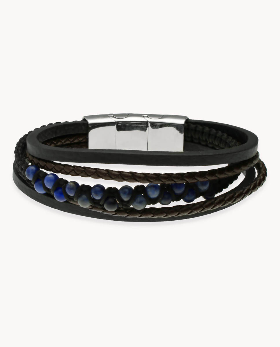 Pulsera de acero inoxidable con cuatro tiras de cuero en diferentes acabados y colores (negro y marrón) y una tira de macramé negro con piedras de Sodalita de 4 mm de diámetro, largo ajustable con pieza extraíble (19,5 cms y 21 cms) y cierre de imán.