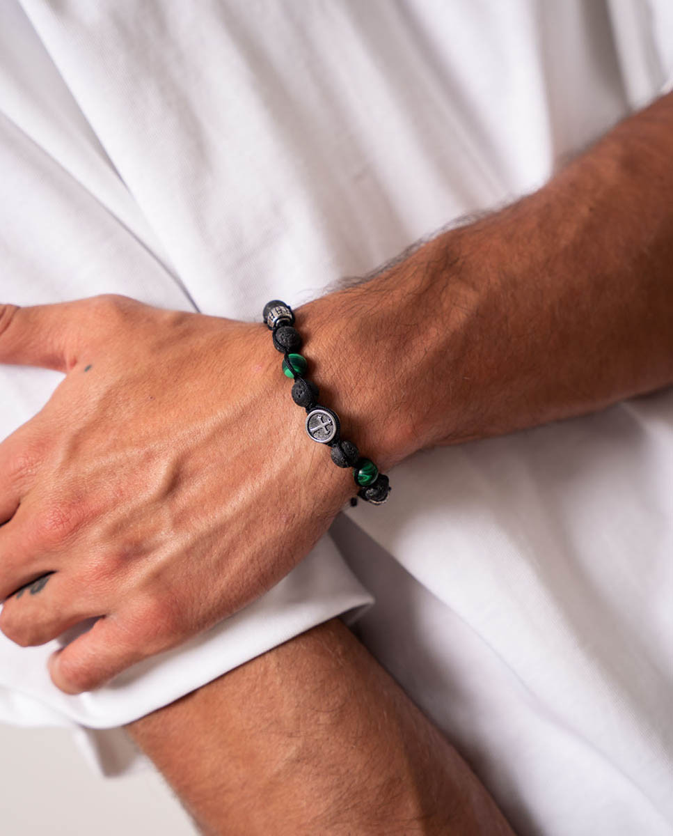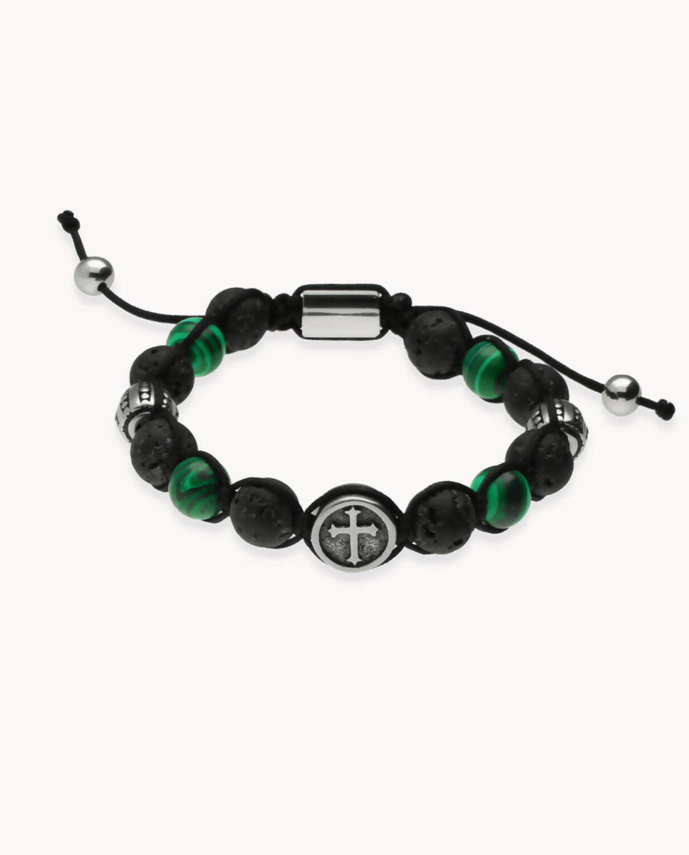 Pulsera de acero inoxidable con nylon negro entrelazando piedra volcánica y Malaquita de 8 mm de diámetro combinadas con entrepiezas de acero inoxidable, pieza central de 10 mm de diámetro con cruz, cierre ajustable de 5,5 cms a 10 cms de diámetro.