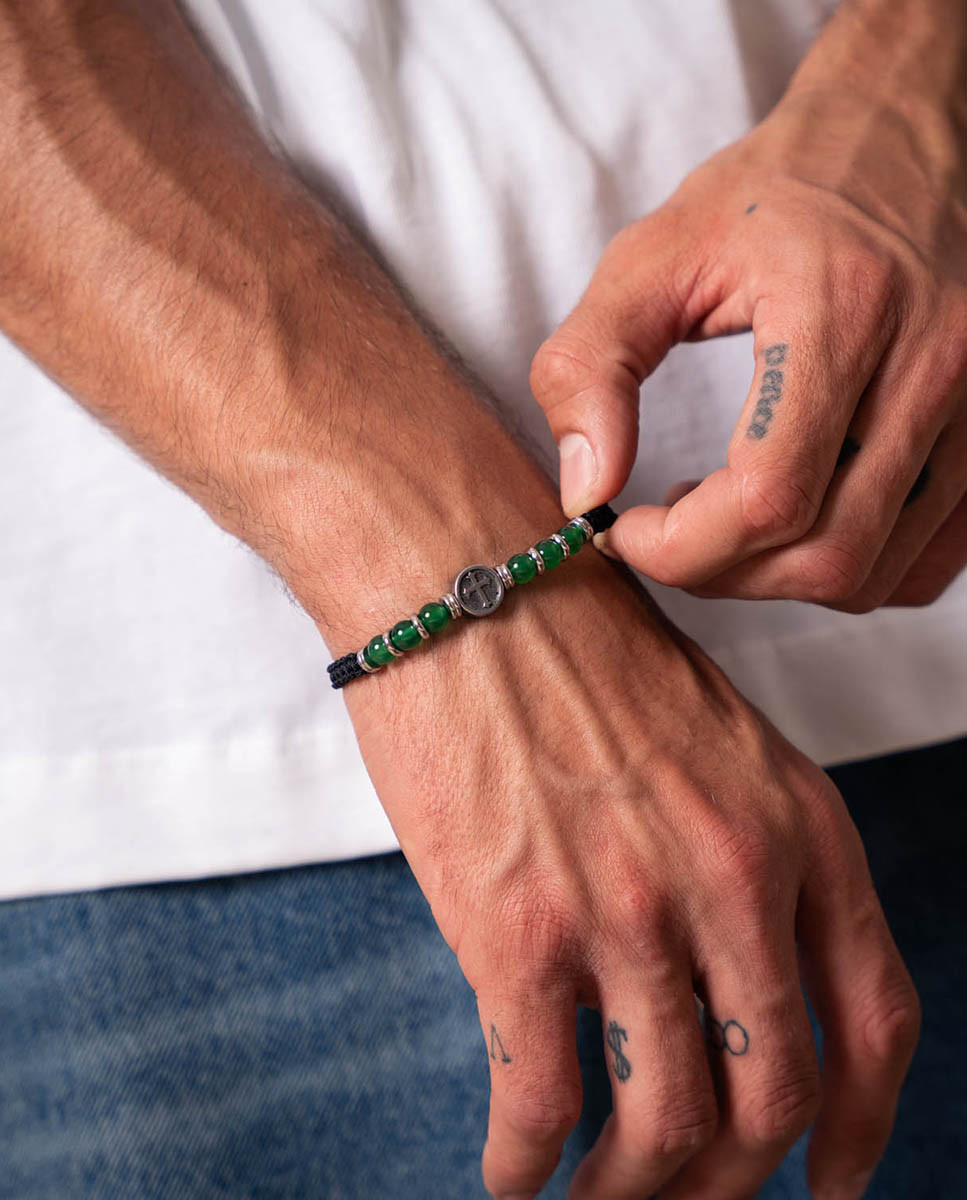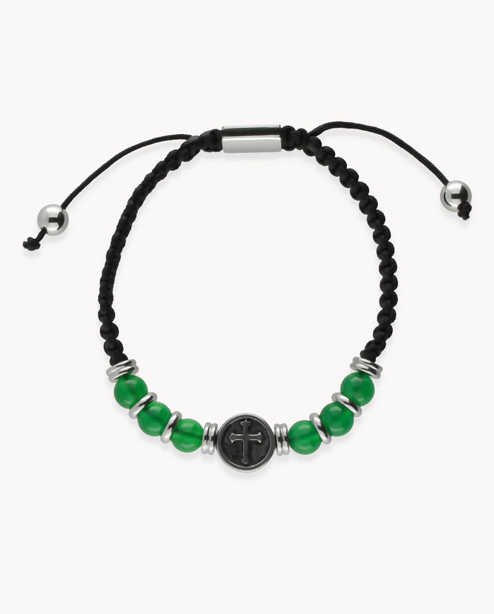 Pulsera cruz guerrera piedras verdes de acero inoxidable y cordón negro