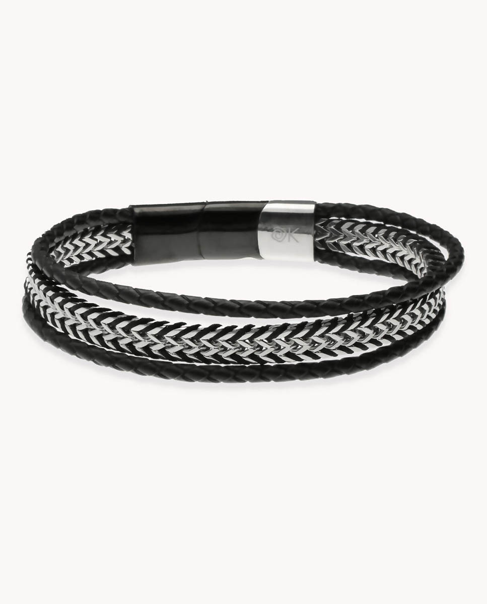 Pulsera de acero inoxidable triple: parte central con malla de acero y nylon negro trenzado, y a ambos lados cuero negro trenzado, largo de 20,5 cms a 21,5 cms y cierre de imán en IP negro y acero con una pieza extraíble.