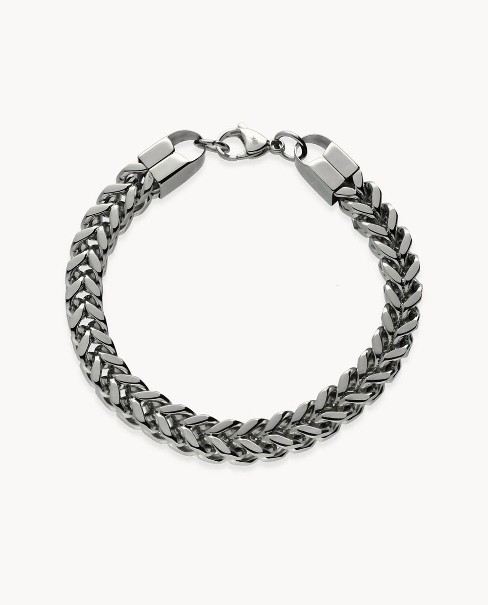Pulsera de acero inoxidable con eslabón de 8 mm de ancho y 8 mm de grosor, largo de 21 cms y cierre de mosquetón.