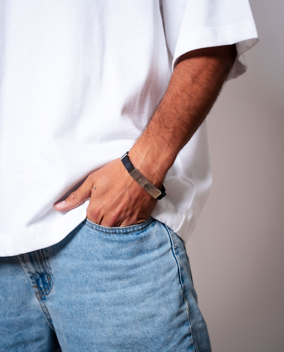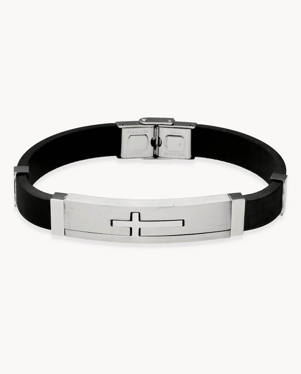 Pulsera de acero inoxidable y caucho negro con costuras en beige de 10 mm de ancho y 3 mm de grosor, placa central de acero matizado de 46 mm x 12 mm (ancho por alto) con detalle de cruz central y motivos en acero inoxidable, largo de 21 cms y cierre regulable.