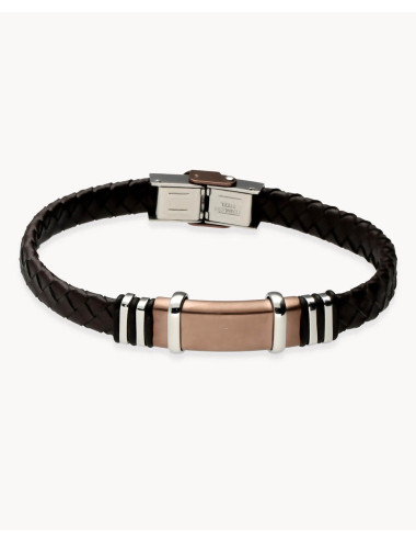 Pulsera de acero inoxidable y cuero marrón trenzado de 8 mm de ancho y 3 mm de grosor, placa central en IP bronce de 28 mm x 10 mm (ancho por alto) y detalles de acero, largo de 21 cms y cierre regulable.