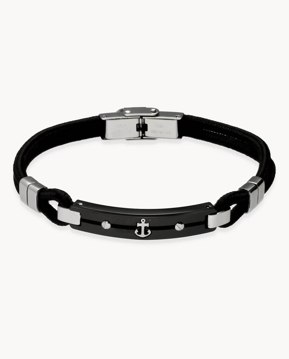 Pulsera de acero inoxidable con nylon doble negro, placa central en IP negro con detalle de ancla de 7 mm x 4 mm (ancho por alto), largo de 20 cms y cierre regulable.