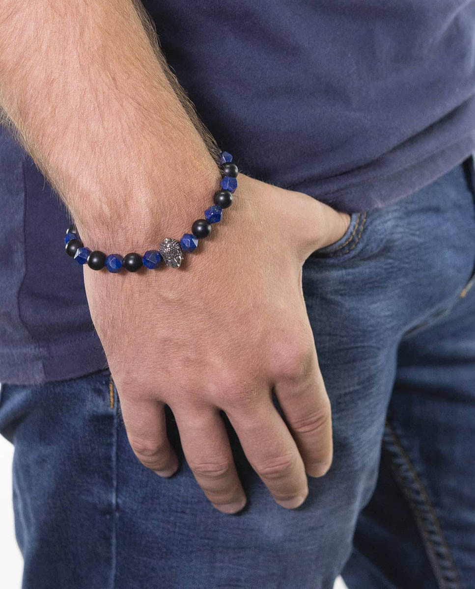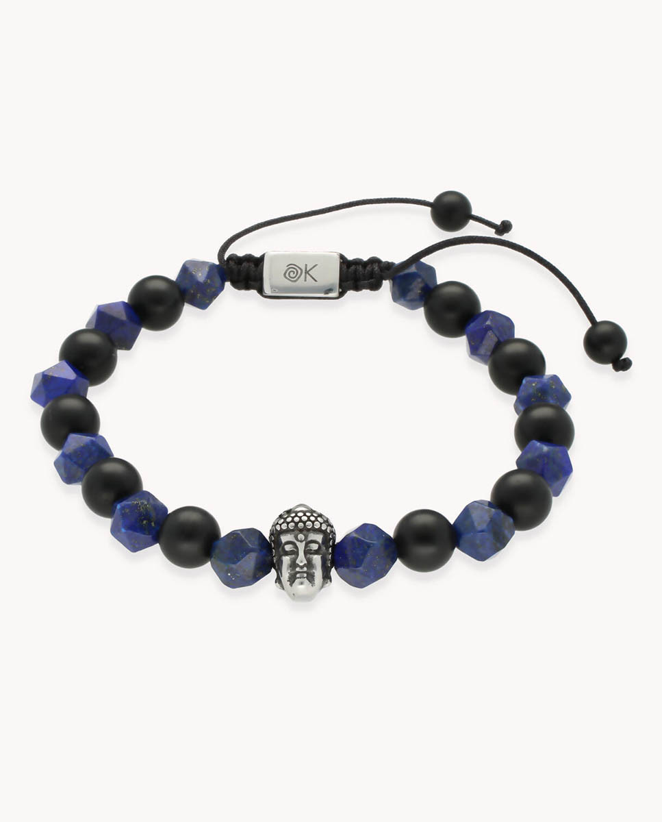 Pulsera de acero inoxidable con piedras naturales de Lapislázuli de 7 mm de diámetro y Ágata negra mate de 8 mm de diámetro, motivo central de Buda de 8 mm x 13 mm (ancho por alto) y cierre regulable desde 7 cms a 10 cms de diámetro.