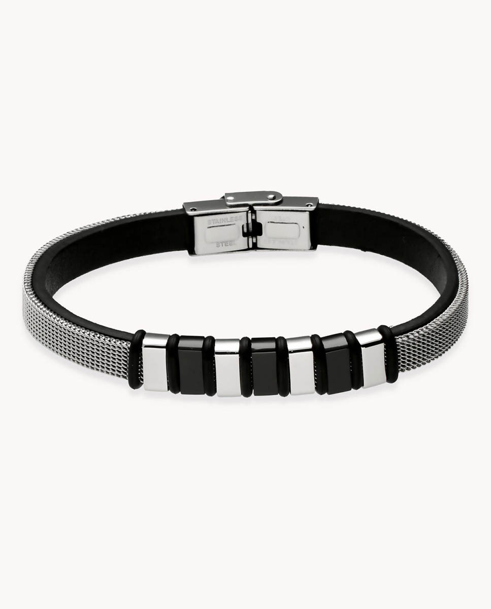 Pulsera de acero inoxidable combinada con cuero negro en el interior de 8 mm de ancho y 3 mm de grosor, apliques centrales de acero e IP negro, largo de 21 cms y cierre regulable.