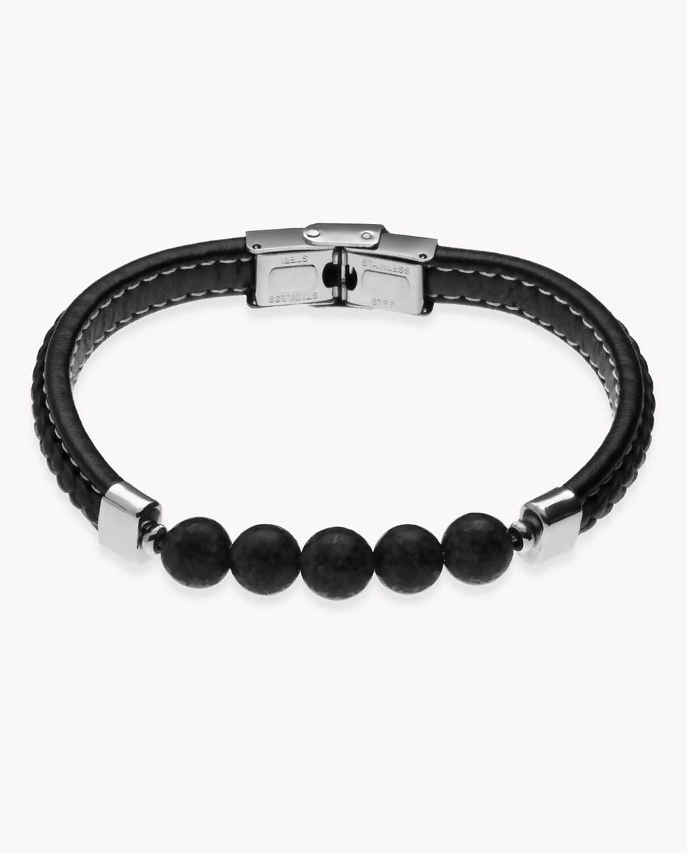 Pulsera de piedras naturales dark cuero negro y acero inoxidable