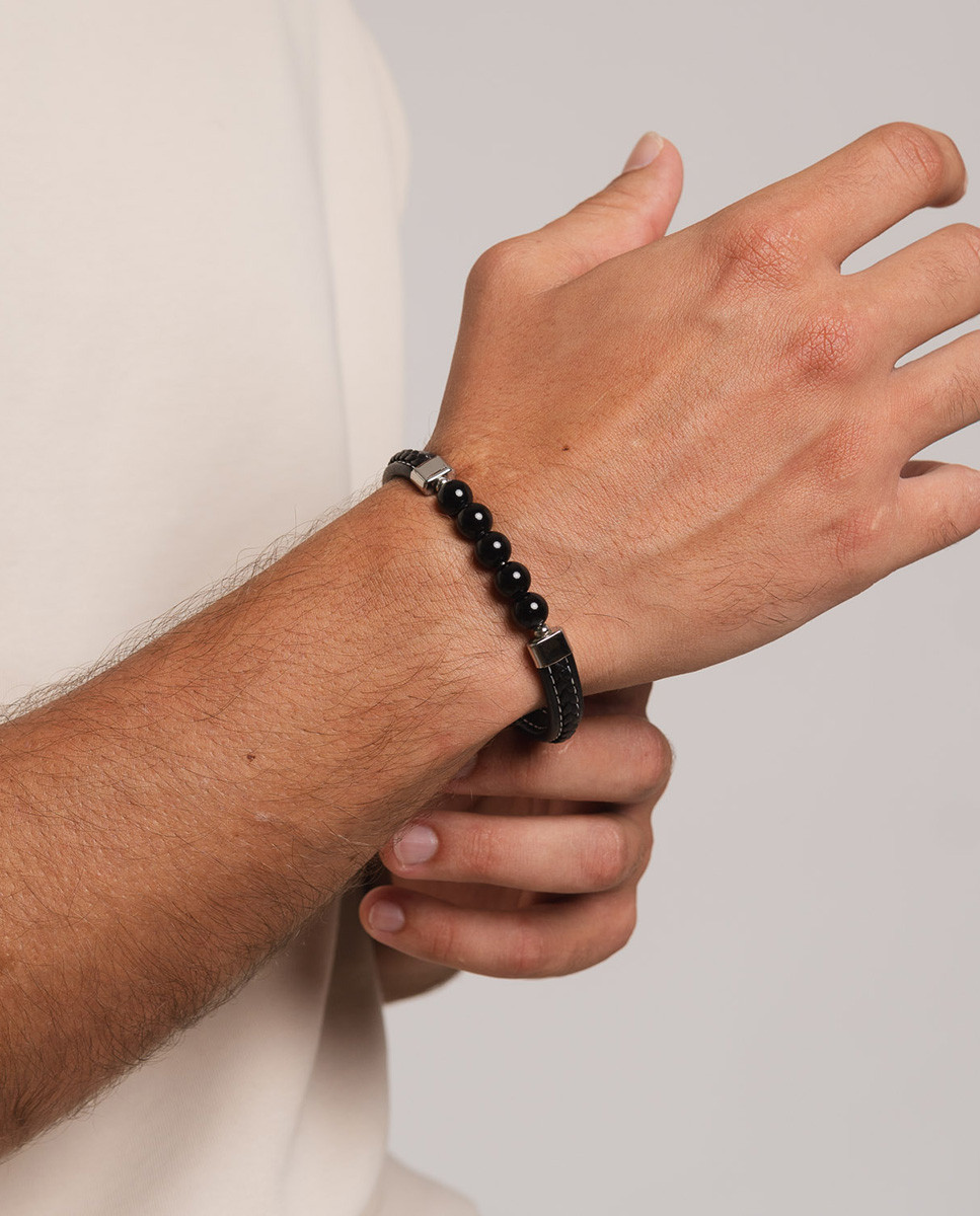 Pulsera de acero inoxidable y cuero negro de 8 mm de ancho con piedras de Ágata negra de 8 mm de diámetro, largo de 21,5 cms y cierre regulable.