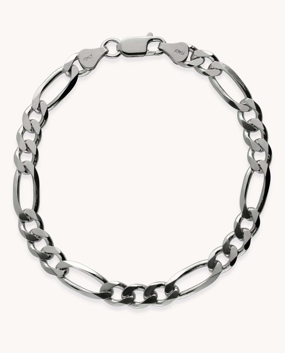 Pulsera de plata de ley 925 bañada en rodio con eslabón tipo cartier de 6,8 mm de ancho, cierre de mosquetón y 21 cms de largo.