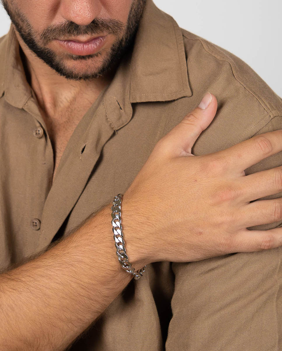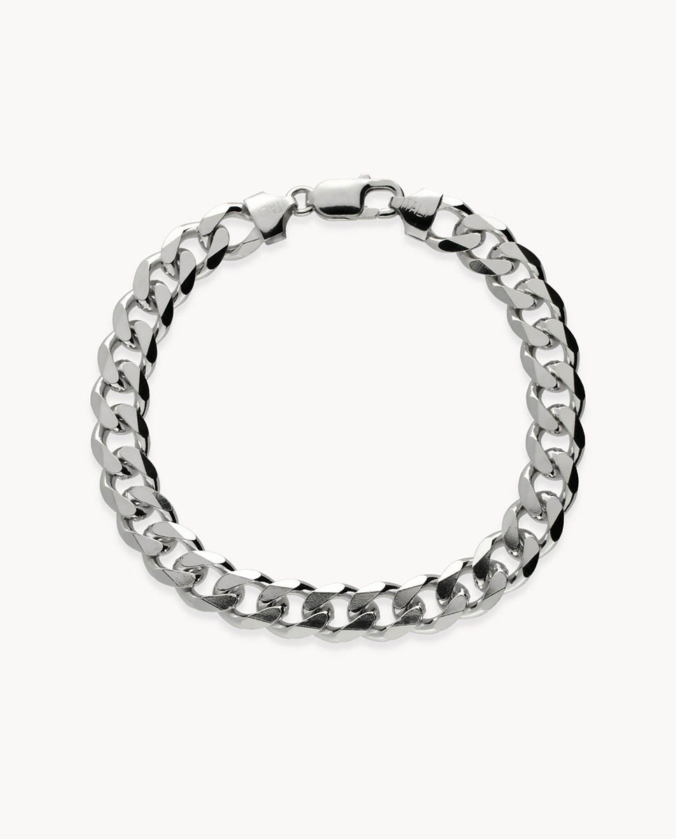 Pulsera de plata de ley 925 bañada en rodio con eslabón tipo barbado de 9,3 mm de ancho, cierre de mosquetón y 22 cms de largo.