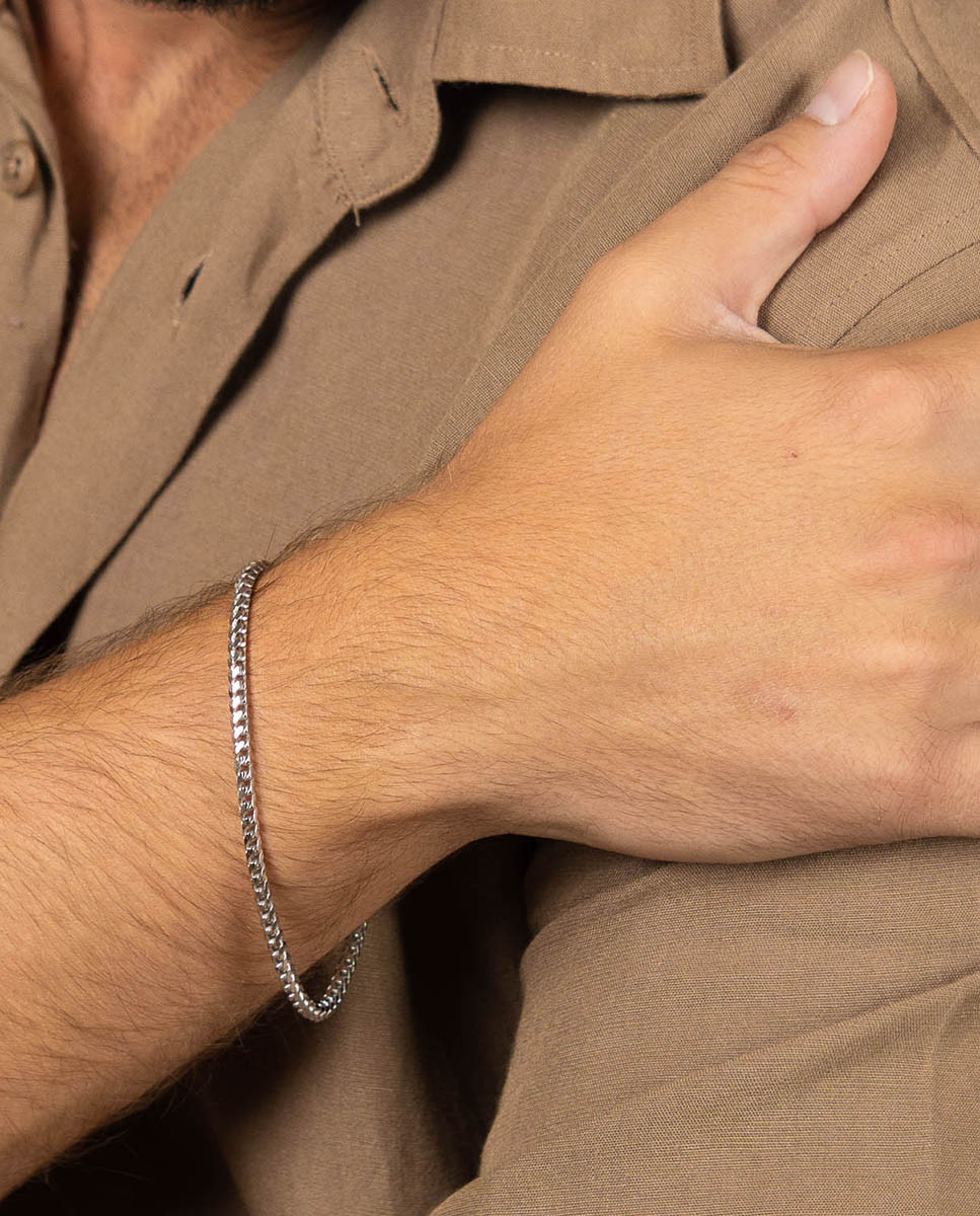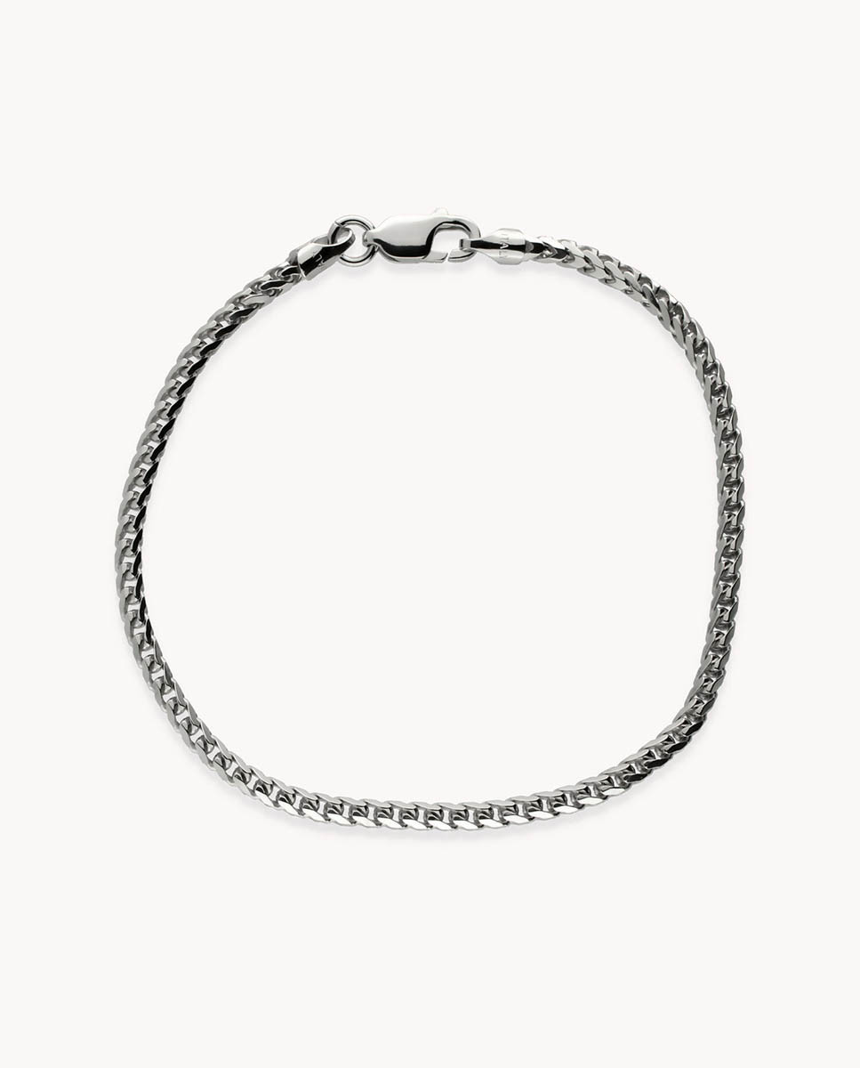 Pulsera de plata de ley 925 bañada en rodio con eslabón de 3,11 mm de ancho, cierre de mosquetón y 21 cms de largo.