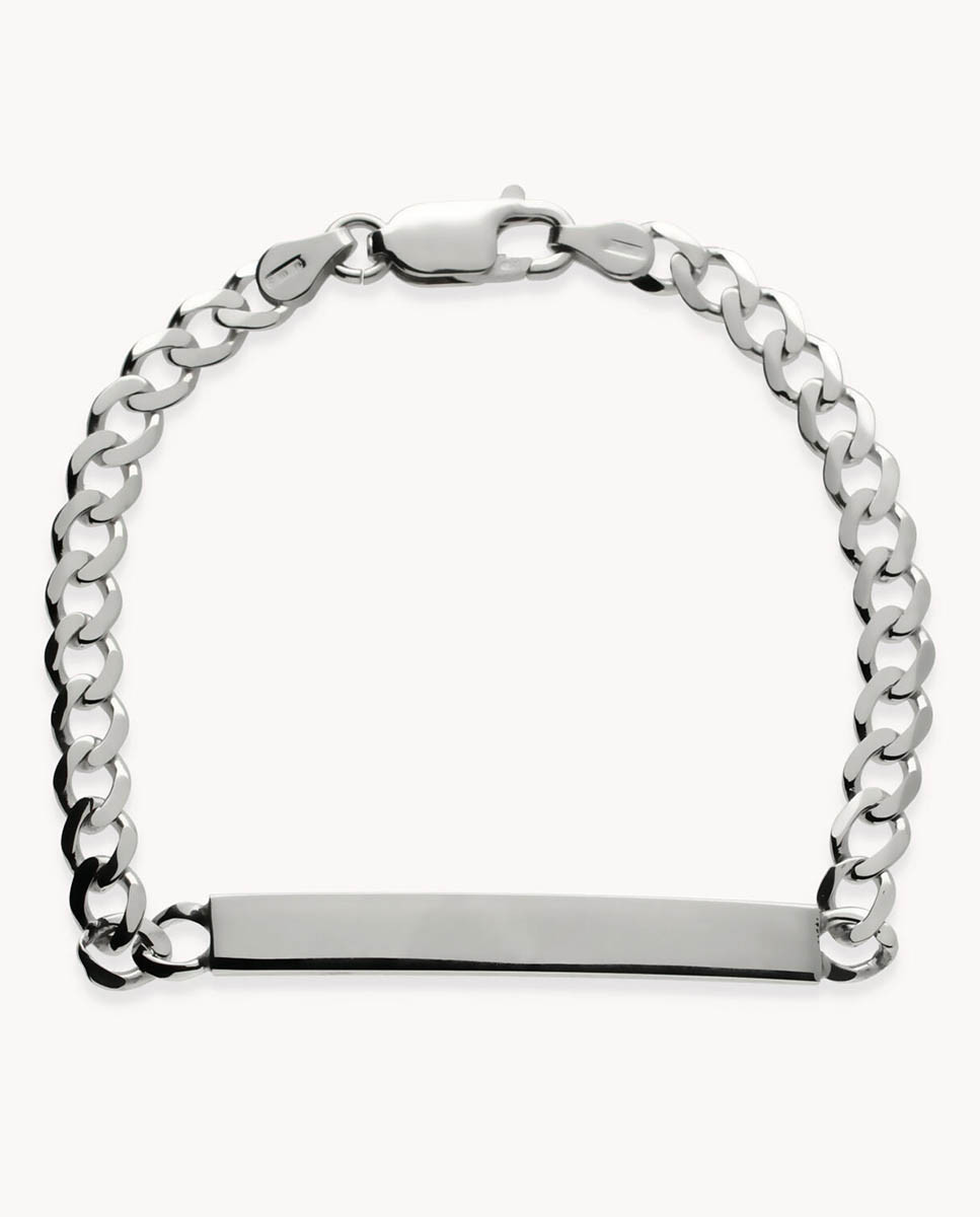 Pulsera de plata de ley 925 bañada en rodio estilo esclava con eslabón tipo barbado de 5 mm de ancho y placa central de 5 mm de ancho y 38 mm de largo, cierre de mosquetón y 18 cms de largo.