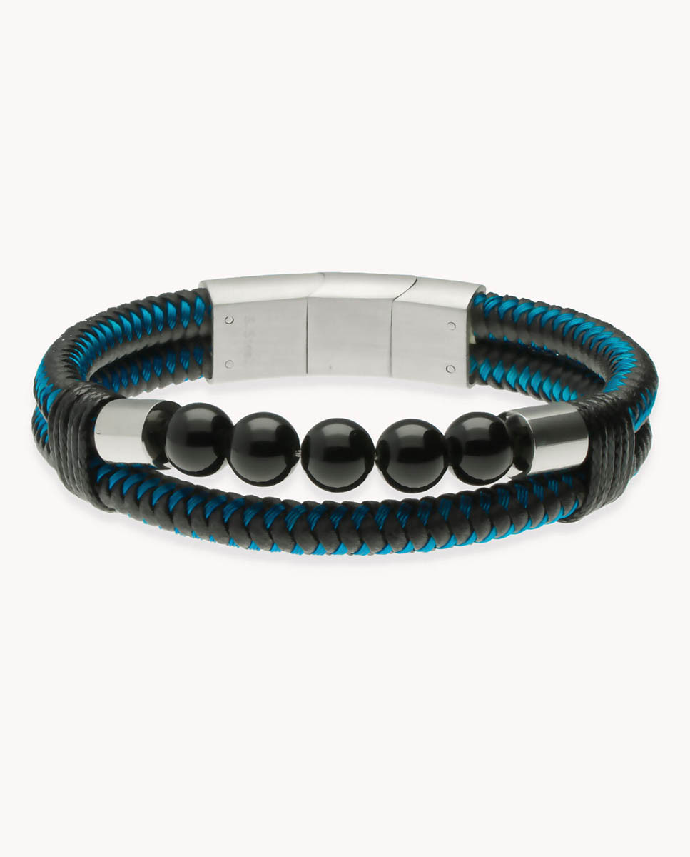 Pulsera de acero inoxidable con dos tiras de cuero negro e hilo metalizado azul trenzados entre ellos, bolas centrales de piedra negra de 12 mm de ancho y 5 mm de grosor con entrepiezas de acero, largo de 20 cms a 21 cms y cierre de imán en acero con una pieza extraíble.