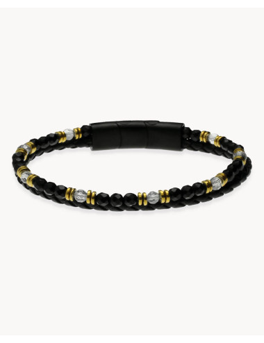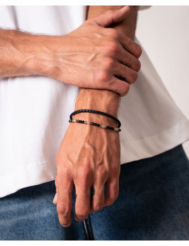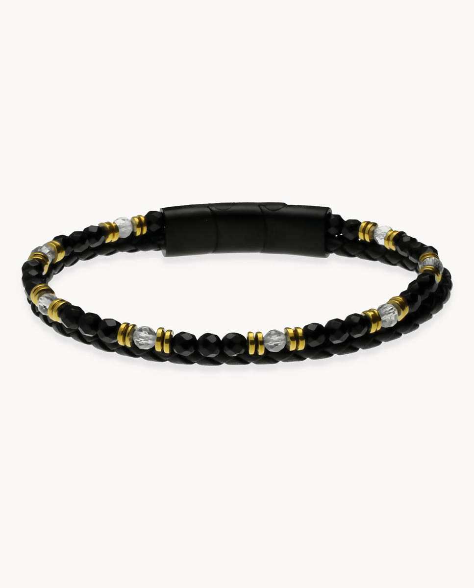 Pulsera de acero inoxidable doble compuesta por cuero trenzado tubular negro de 4 mm de grosor y piedras de Ágata negra facetadas de 4 mm de diámetro combinadas con entrepiezas de acero inoxidable bañadas en oro 18K y cristal blanco, largo ajustable con pieza extraíble (19,5 cms y 20,5 cms) y cierre de imán.