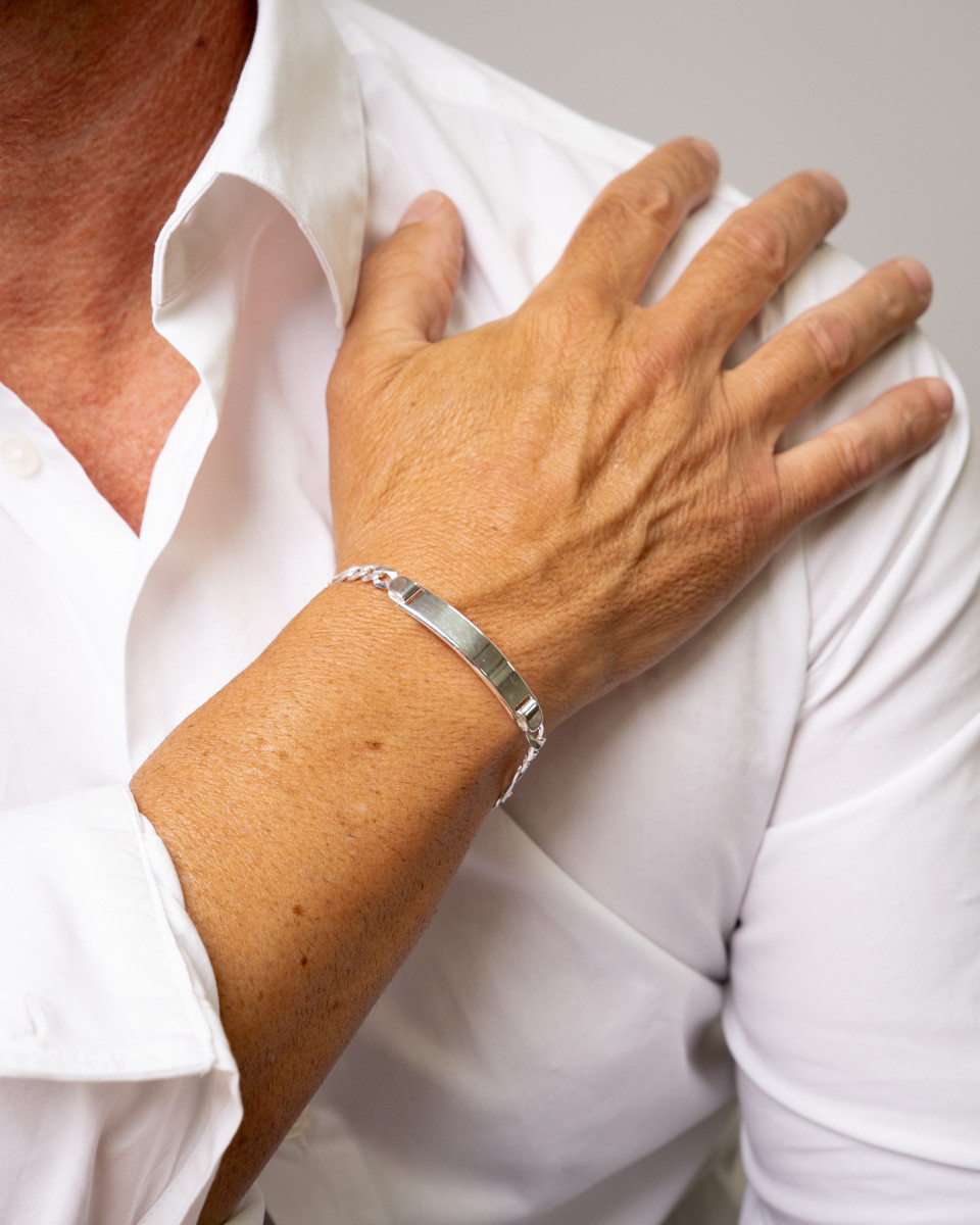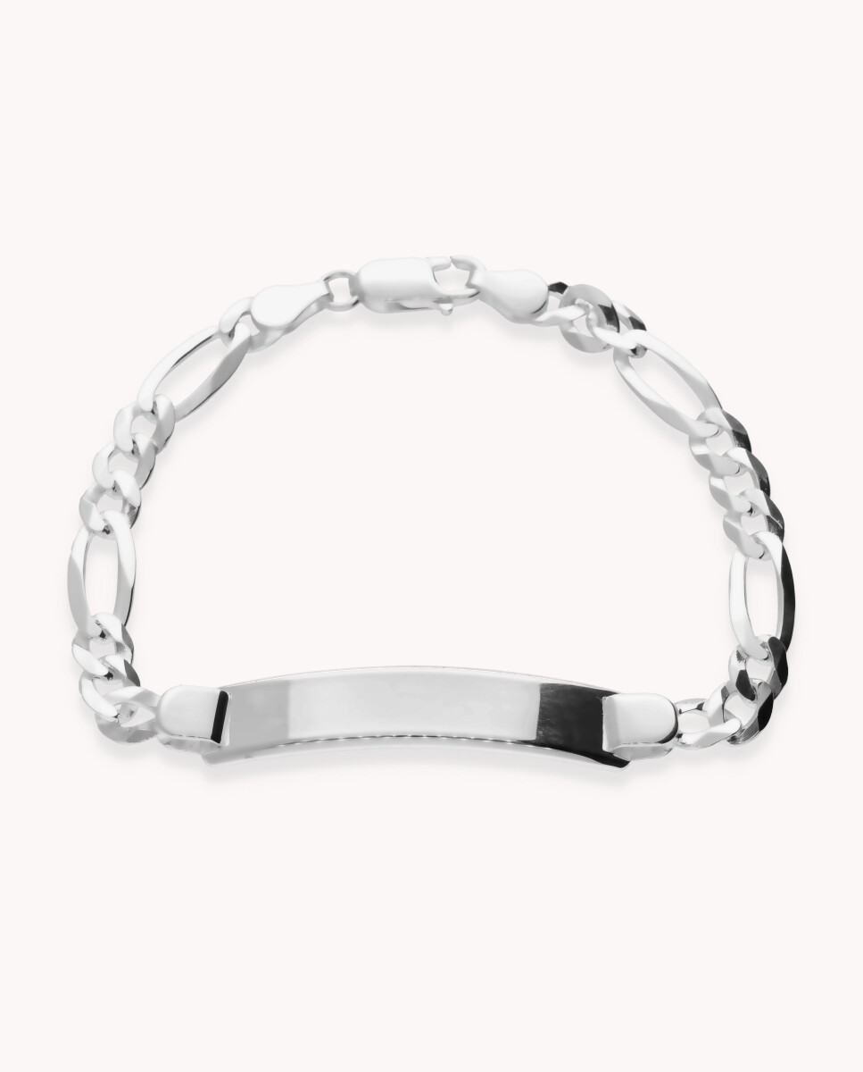 Pulsera de plata de ley 925 estilo esclava con eslabón fígaro de 5 mm de ancho y placa central de 7 mm de ancho y 40 mm de largo, 19 cms y cierre mosquetón.