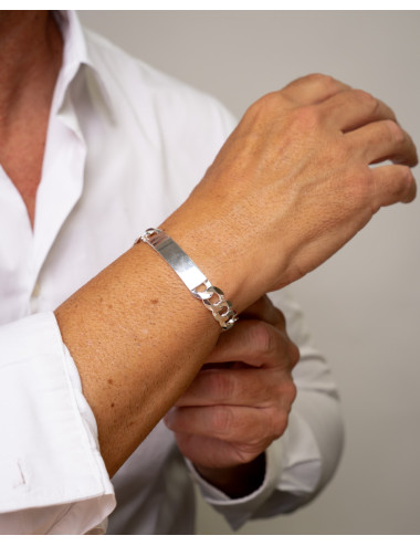 Pulsera de plata de ley 925 estilo esclava con eslabón cartier de 10 mm de ancho y placa central de 11 mm de ancho y 40 mm de largo, 21 cms de largo y cierre mosquetón.