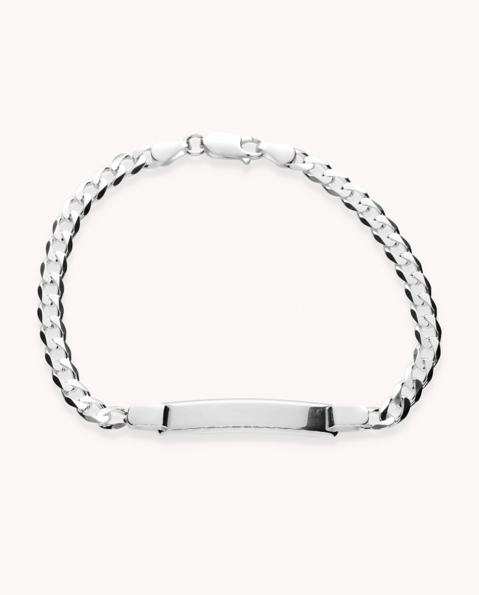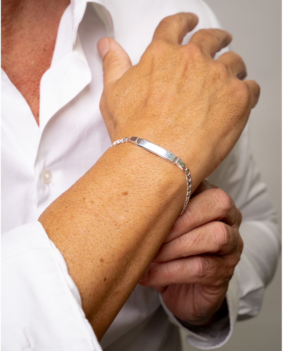 Pulsera de plata de ley 925 estilo esclava con eslabón barbado plano de 4 mm de ancho y placa central de 5 mm de ancho y 30 mm de largo, 19 cms de largo y cierre mosquetón.