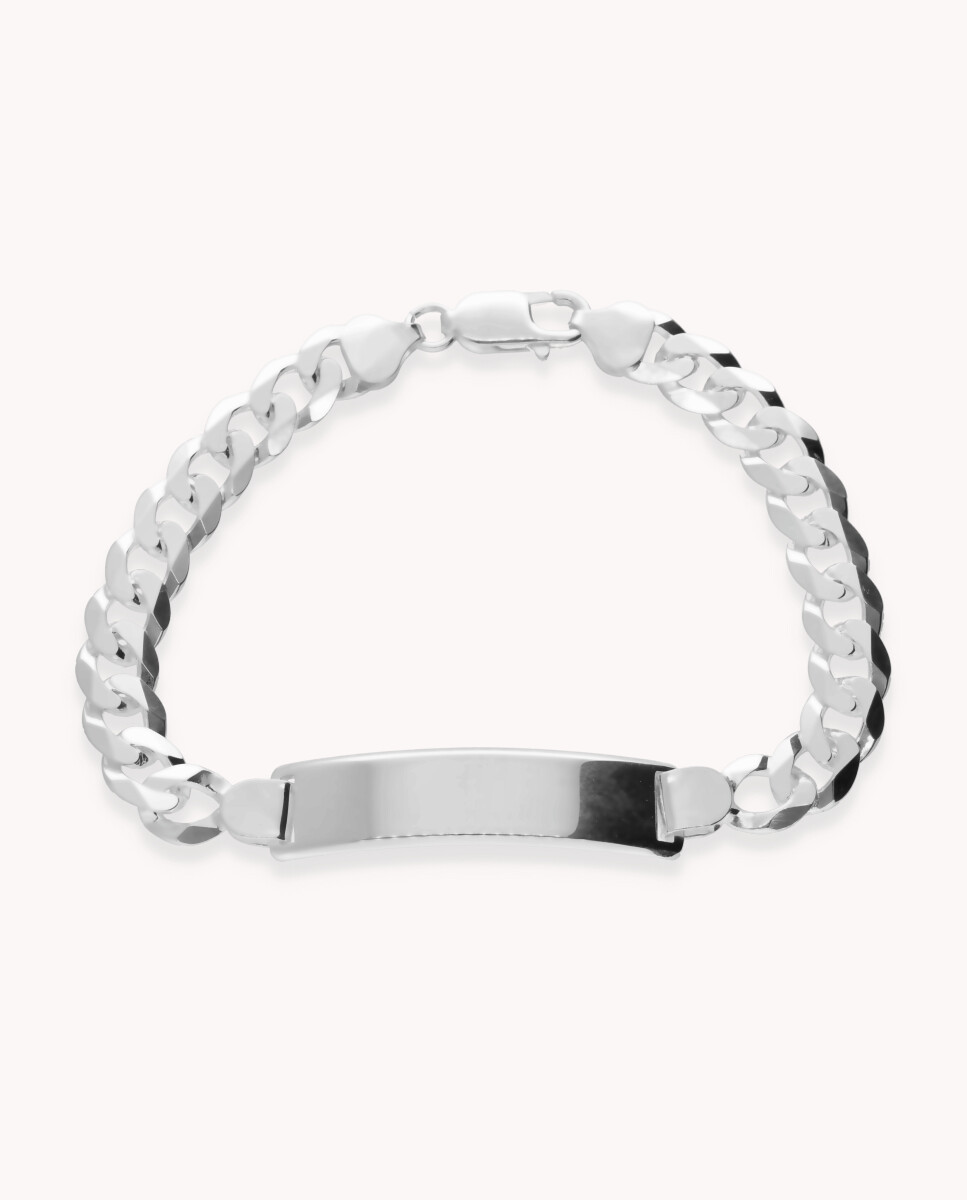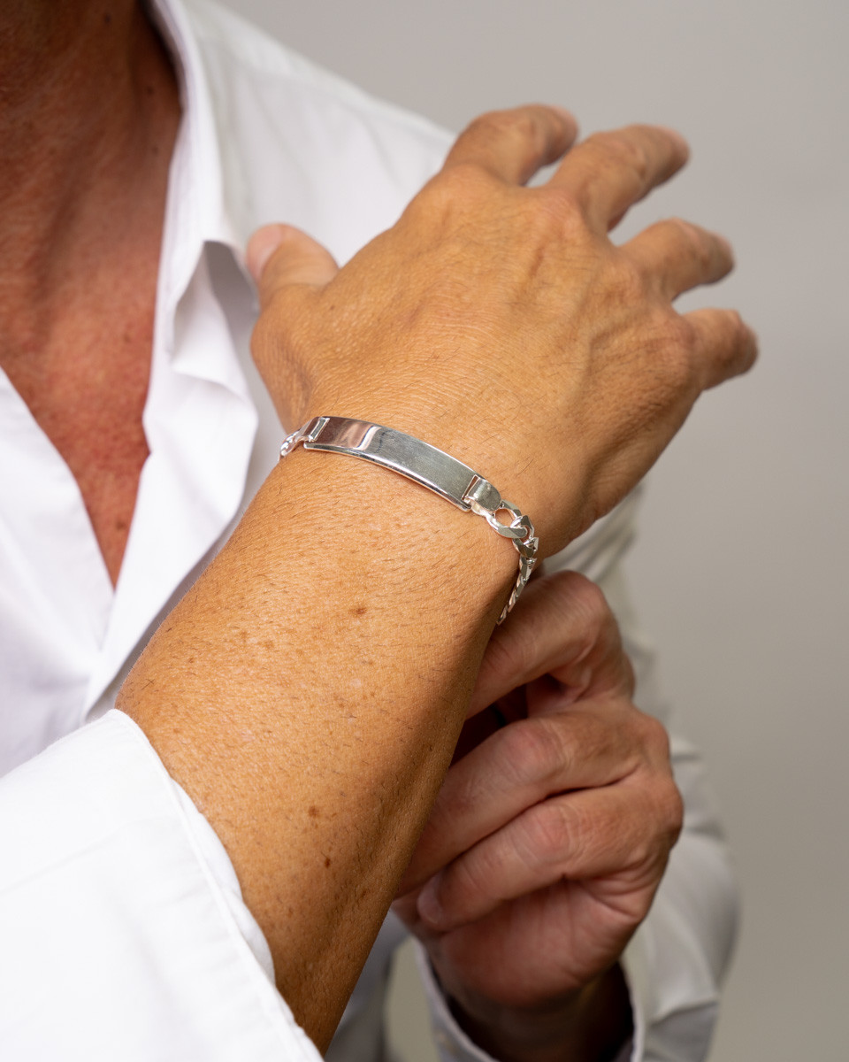 Pulsera de plata de ley 925 estilo esclava con eslabón barbado plano de 8 mm de ancho y placa central de 9 mm de ancho y 40 mm de largo, 21,5 cms y cierre mosquetón.