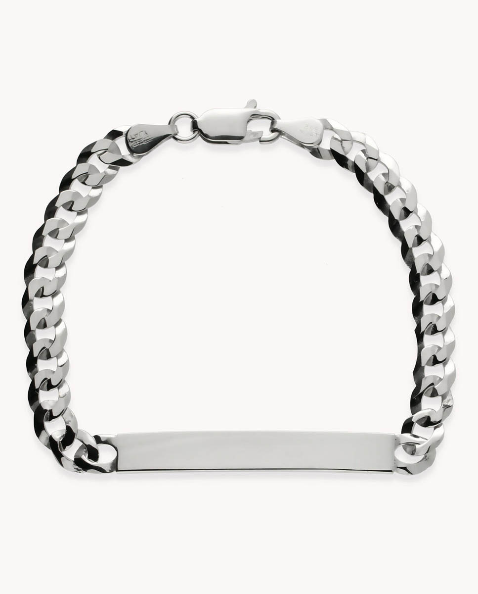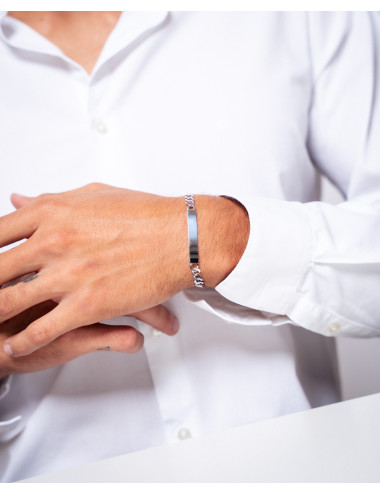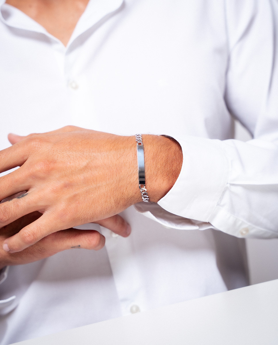 Pulsera de plata de ley 925 bañada en rodio estilo esclava con eslabón tipo barbado de 6 mm de ancho y placa central de 6 mm de ancho y 40 mm de largo, cierre de mosquetón y 19 cms de largo.