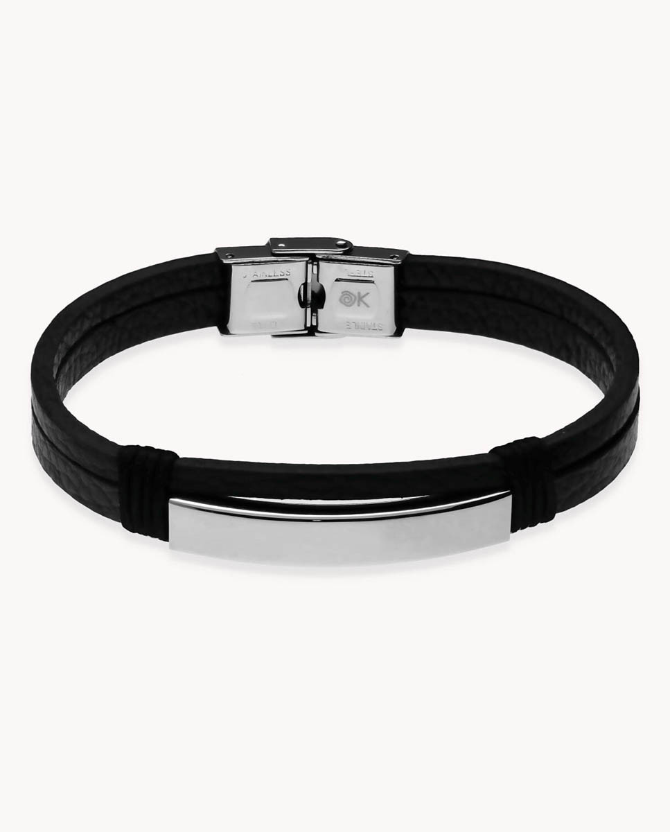 Pulsera de acero inoxidable con doble tira de cuero negro (4 mm y 6 mm) y 3 mm de grosor con placa central de 40 mm x 7 mm (largo por ancho), cierre regulable y largo de 21 cms.