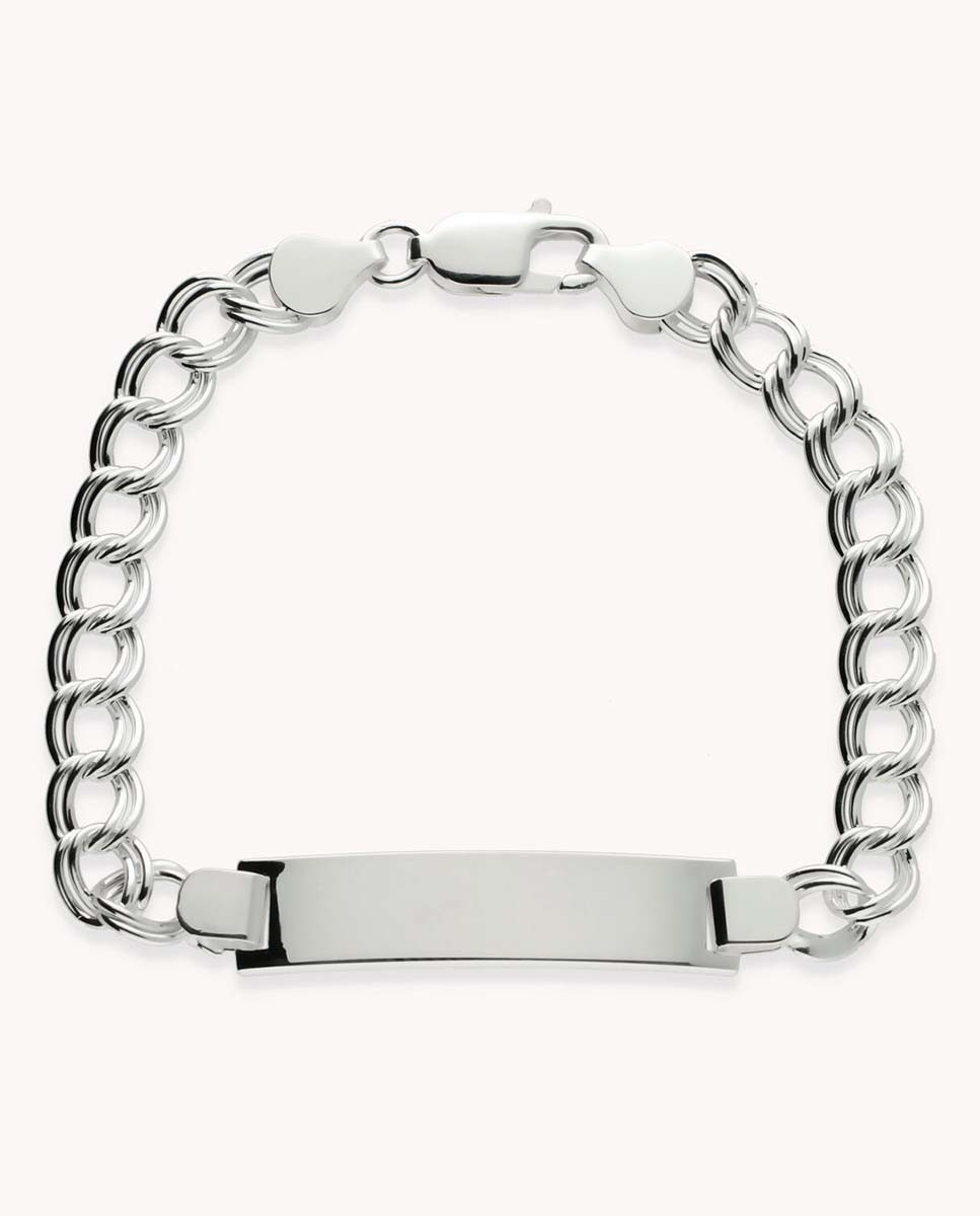 Pulsera de plata de ley 925 estilo esclava con eslabón tipo húngaro de 8 mm de ancho y placa central de 8 mm de ancho y 38 mm de largo, cierre de mosquetón y 20,5 cms de largo.