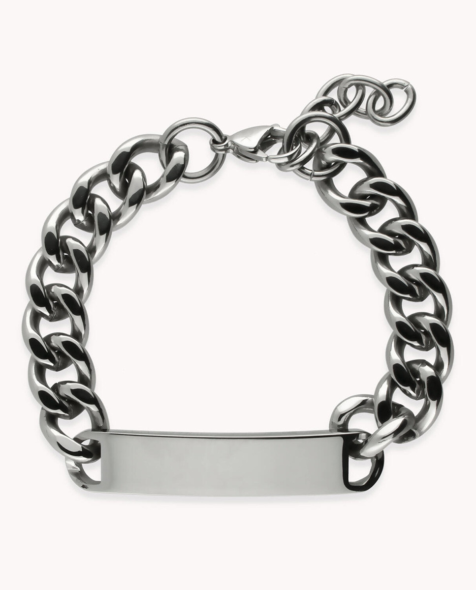Pulsera de acero inoxidable estilo esclava con eslabón tipo barbado de 10 mm de ancho y placa central de 10 mm de ancho y 40 mm de largo, cierre de mosquetón y 18 cms de largo más 3,5 cms de alargador.