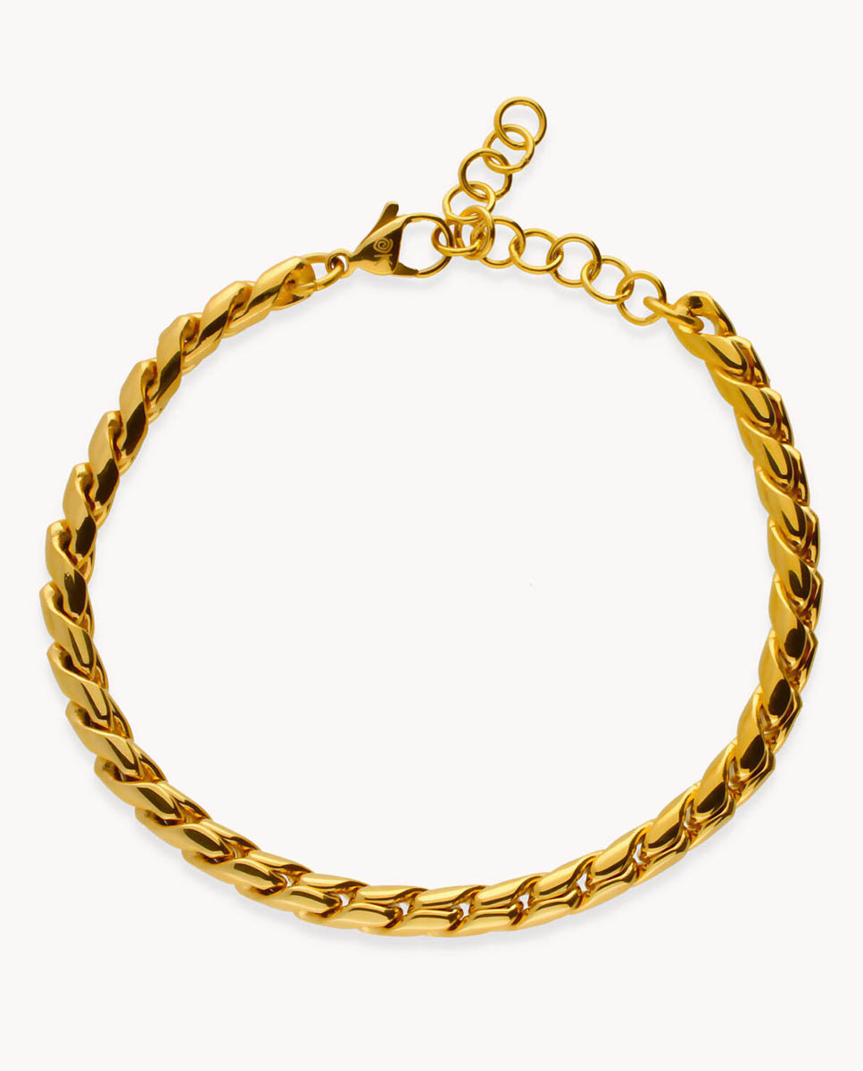Pulsera de acero inoxidable bañado en oro 18K, largo 18 cms más 4 cms de alargador y cierre de mosquetón.
