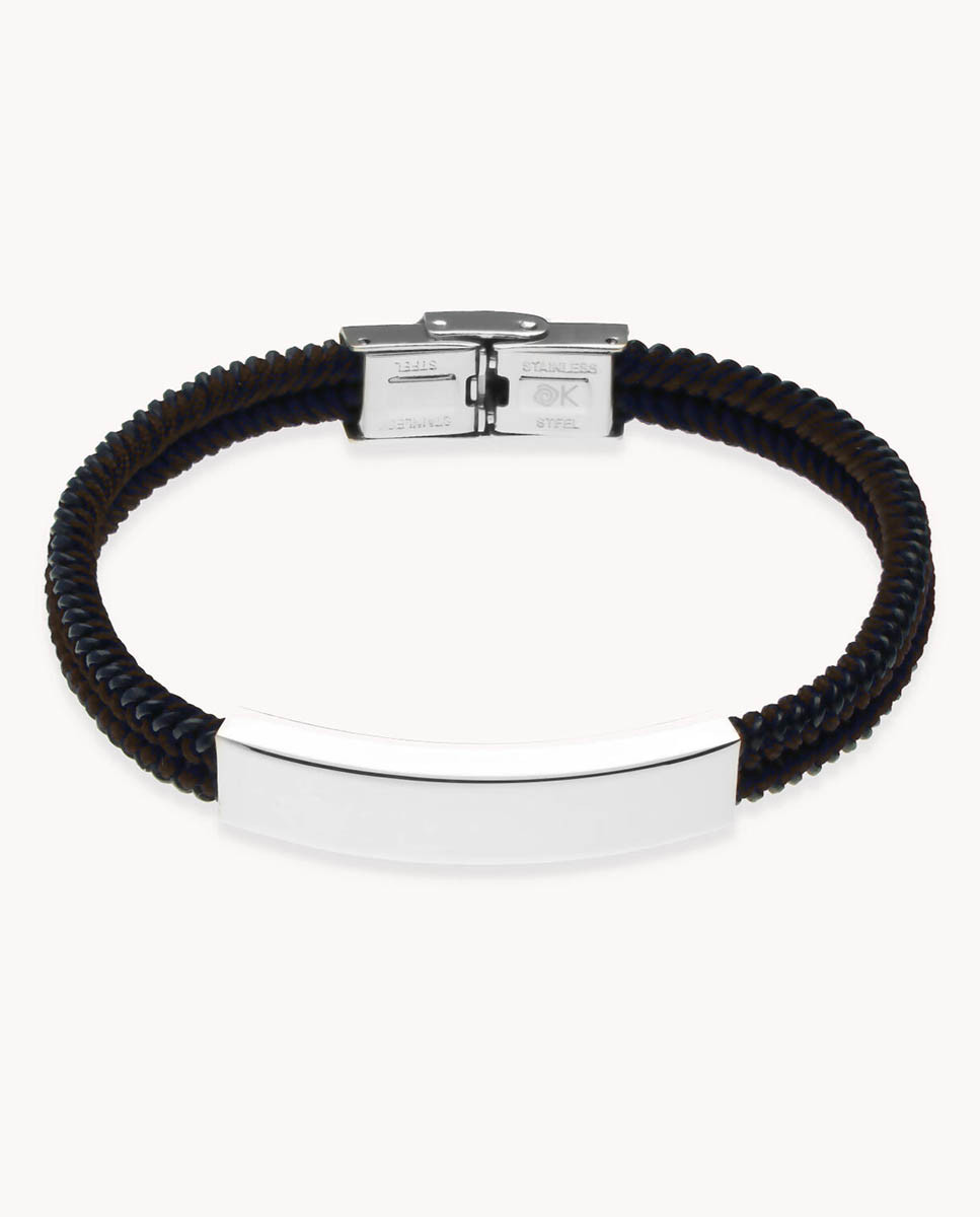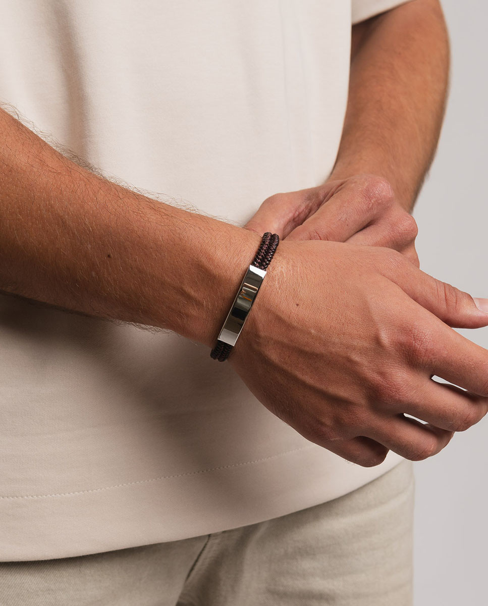 Pulsera de acero inoxidable con cuero marrón y nylon marrón trenzados de 3 mm de grosor y 7,5 mm de ancho, placa central de 40 mm x 9 mm (ancho por alto), largo de 21,5 cms y cierre regulable.