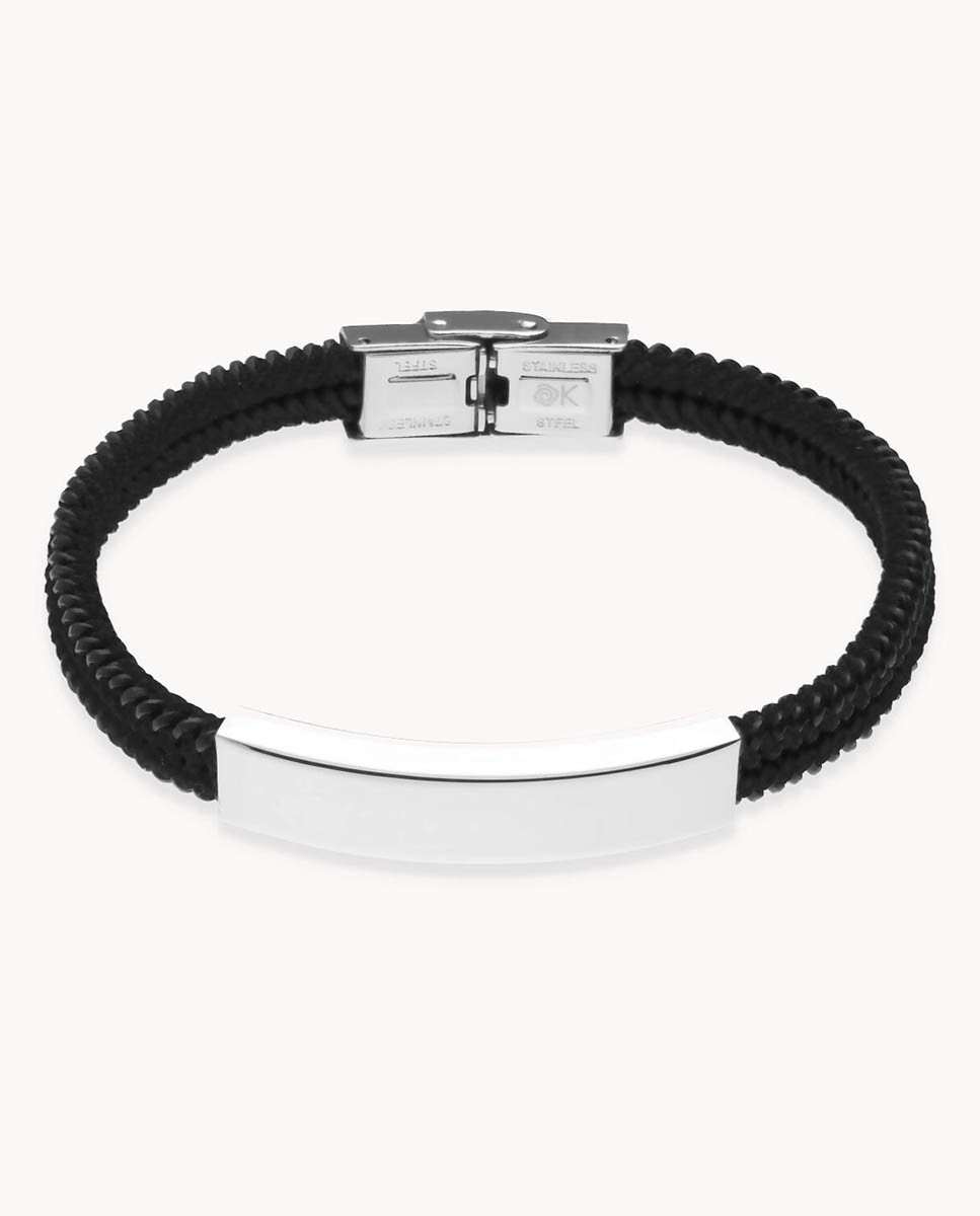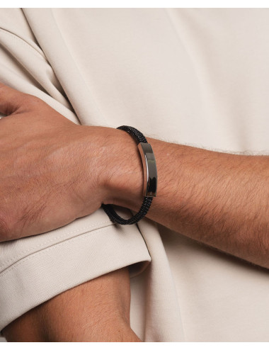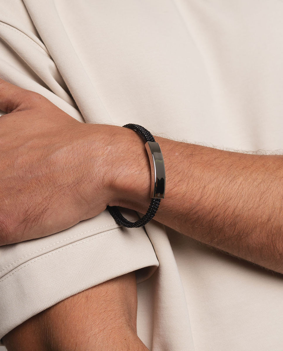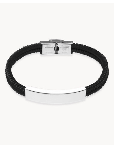 Pulsera de acero inoxidable con cuero negro y nylon negro trenzados de 3 mm de grosor y 7,5 mm de ancho, placa central de 40 mm x 9 mm (ancho por alto), largo de 21,5 cms y cierre regulable.