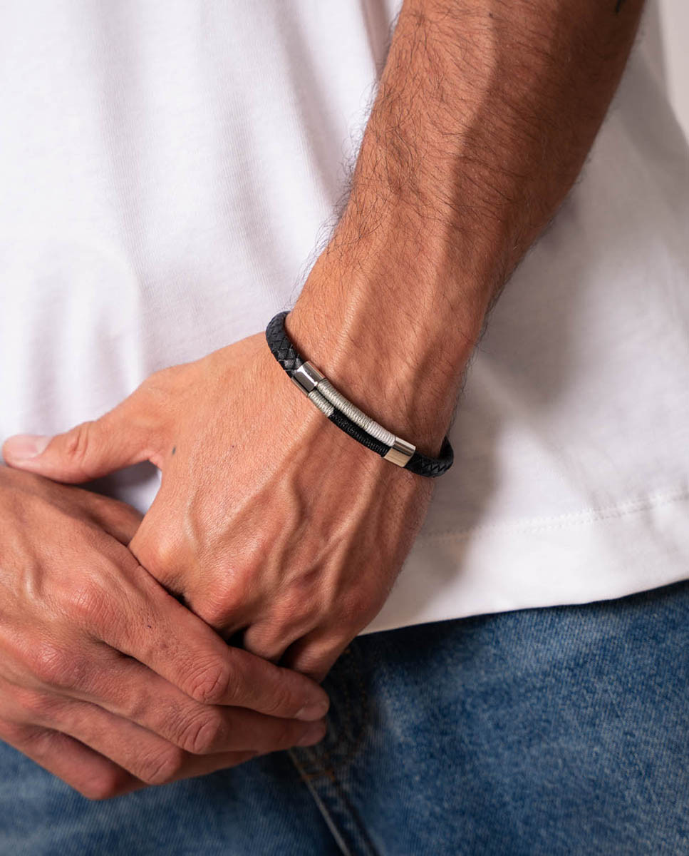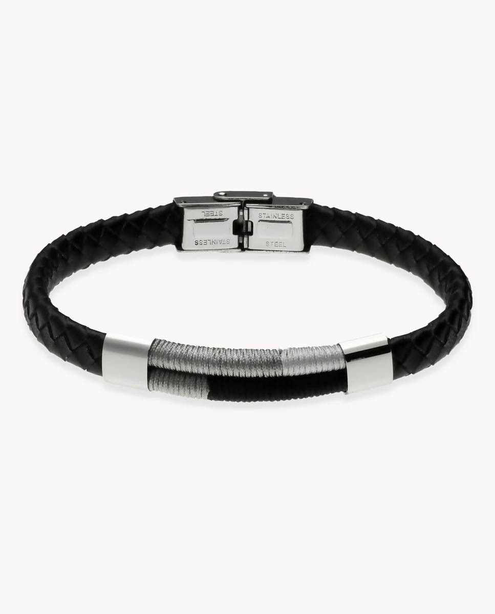 Pulsera de acero inoxidable y cuero trenzado negro de 8 mm de ancho y 4 mm de grosor, parte central con nylon en diferentes tonos grises y negro 30 mm x 8 mm (ancho por alto) y entrepiezas de acero inoxidable, largo de 21,5 cms y cierre regulable.