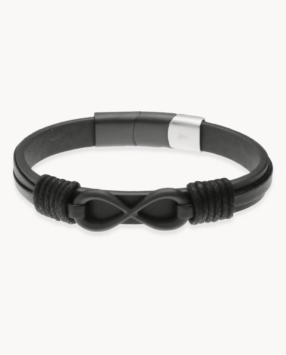 Pulsera de acero inoxidable con cuero negro y dos tiras de cuero negro sobrepuestas de 10 mm de ancho y 4 mm de grosor, infinito central de 35 mm x 12 mm (ancho por alto), largo de 19,5 cms a 20,5 cms y cierre de imán en IP negro y acero con una pieza extraíble.