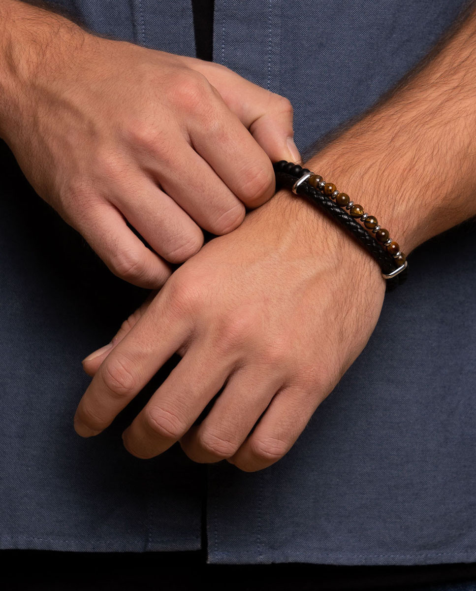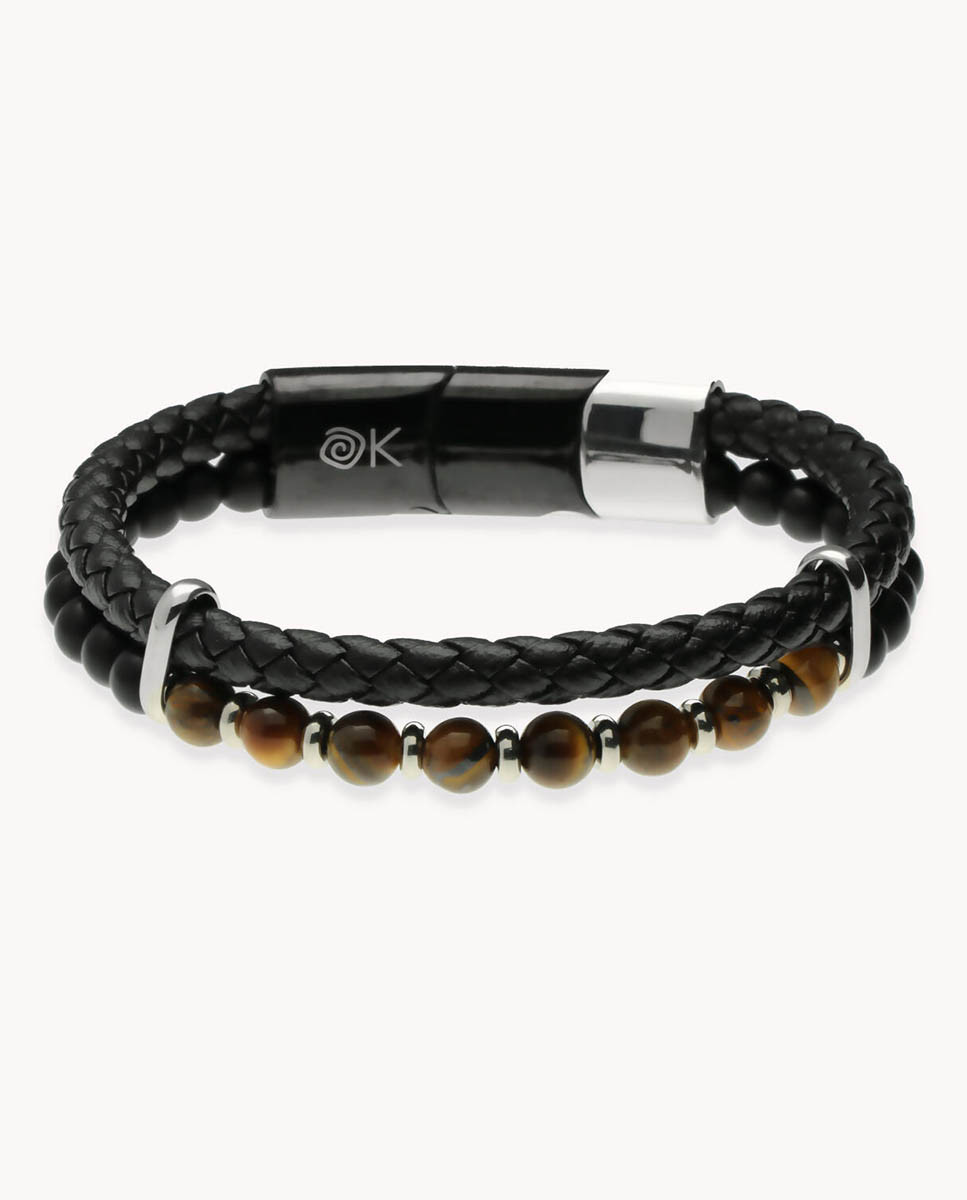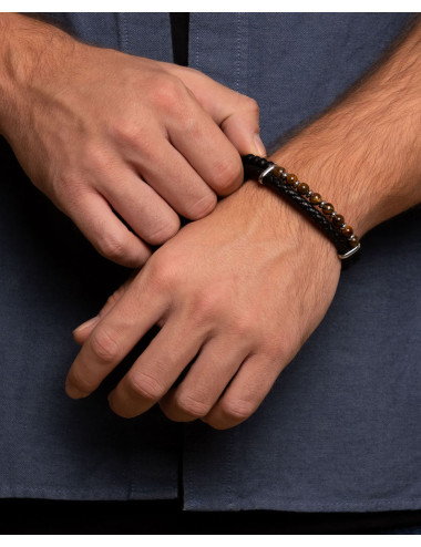 Pulsera de acero inoxidable doble: cuero trenzado tubular negro de 5 mm de grosor y piedras de Ojo de Tigre y Ágata negra mate de 6 mm de diámetro combinadas con entrepiezas de acero, largo de 20 cms a 21 cms y cierre de imán con una pieza extraíble.