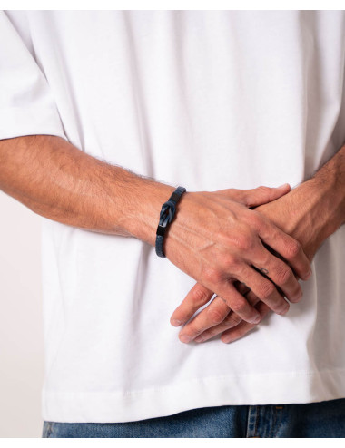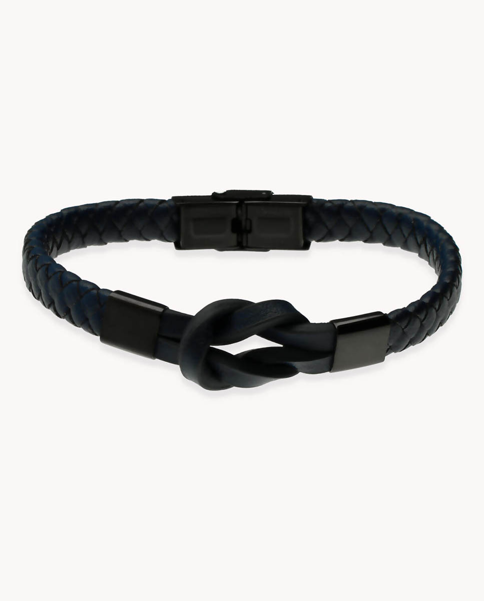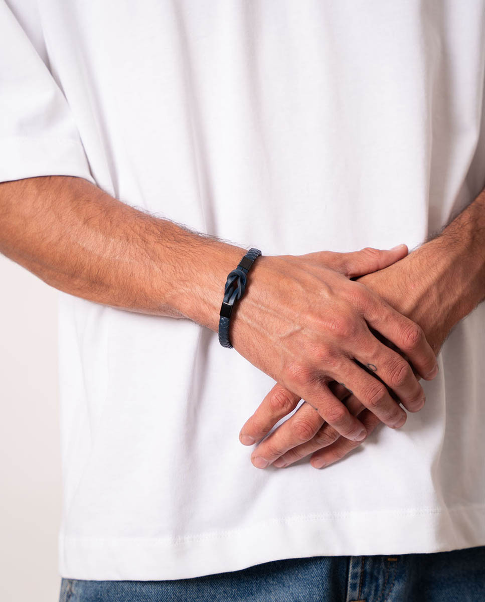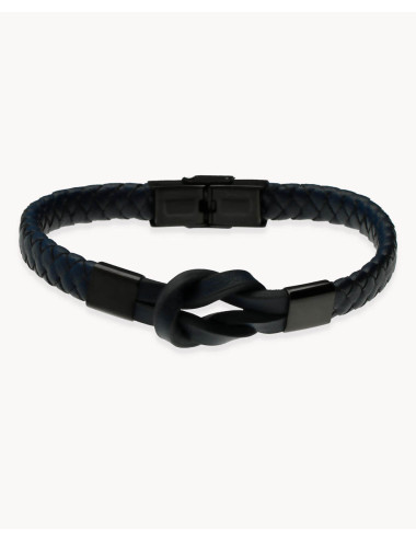 Pulsera de acero inoxidable y cuero trenzado azul de 7 mm de ancho y 3 mm de grosor con nudo central de 30 mm x 15 mm (ancho por alto), largo de 21 cms y cierre regulable en IP negro.