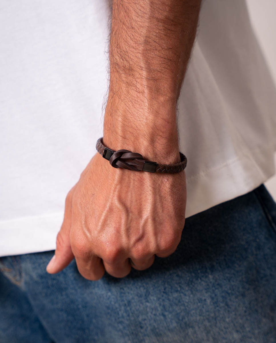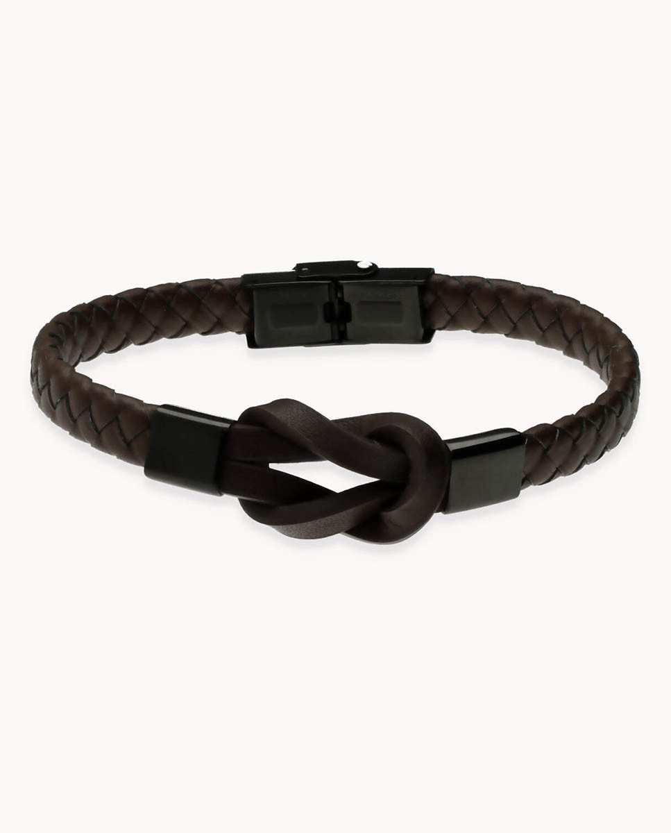 Pulsera de acero inoxidable y cuero trenzado marrón de 7 mm de ancho y 3 mm de grosor con nudo central de 30 mm x 15 mm (ancho por alto), largo de 21 cms y cierre regulable en IP negro.