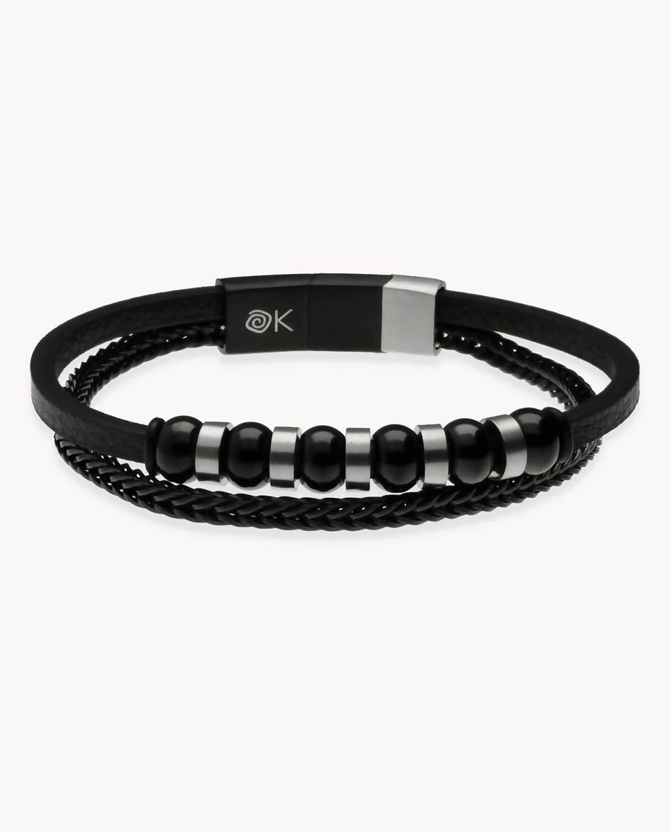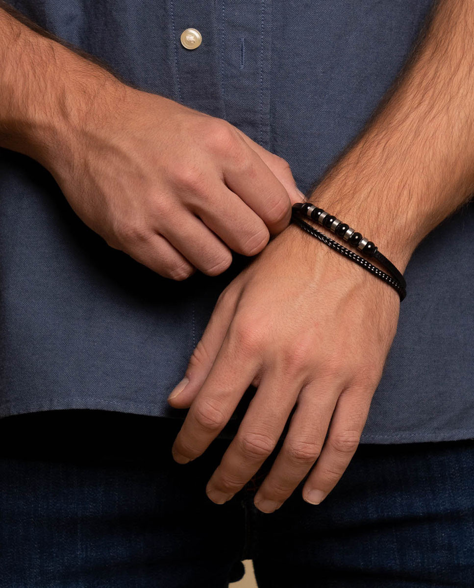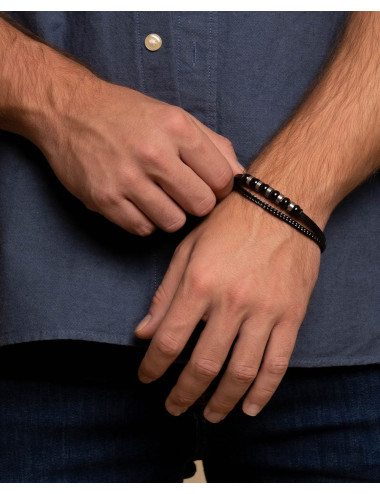 Pulsera de acero inoxidable doble: cuero negro de 4 mm de ancho y 3 mm de grosor con detalle central de bolas en IP negro combinadas con entrepiezas de acero y cadena barbada de 3 mm de ancho en IP negro, largo de 20 cms a 21 cms y cierre de imán con una pieza extraíble.