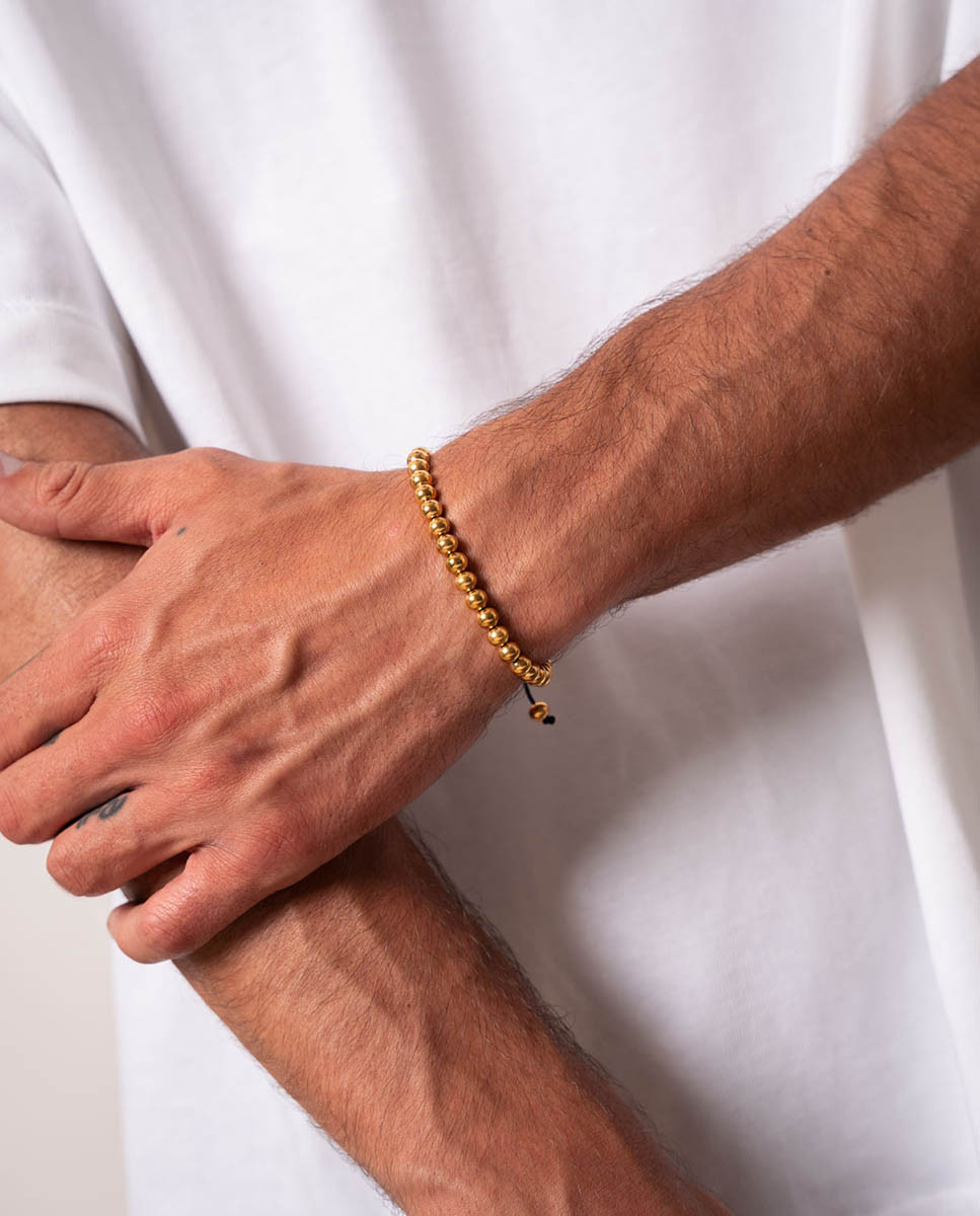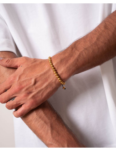 Pulsera de acero inoxidable compuesta por bolas de acero inoxidable bañado en oro 18K de 6 mm de diámetro y cierre ajustable de 5,5 cms a 10 cms de diámetro.