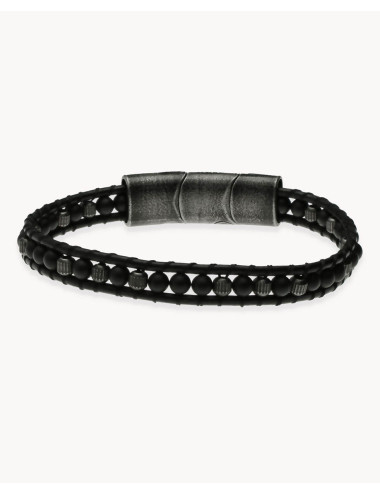 Pulsera piedras enlazadas de acero inoxidable y cuero negro