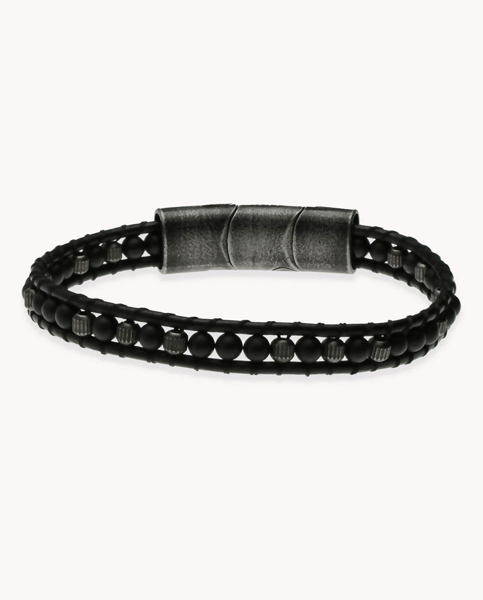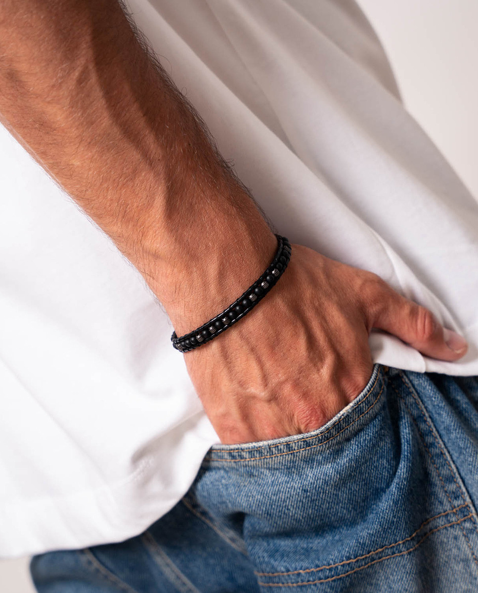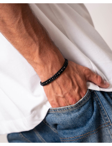 Pulsera de acero inoxidable y cuero negro con bolas de Ágata negra mate de 4 mm de diámetro combinadas con entrepiezas de acero inoxidable, largo ajustable con pieza extraíble (20 cms y 21 cms) y cierre de imán