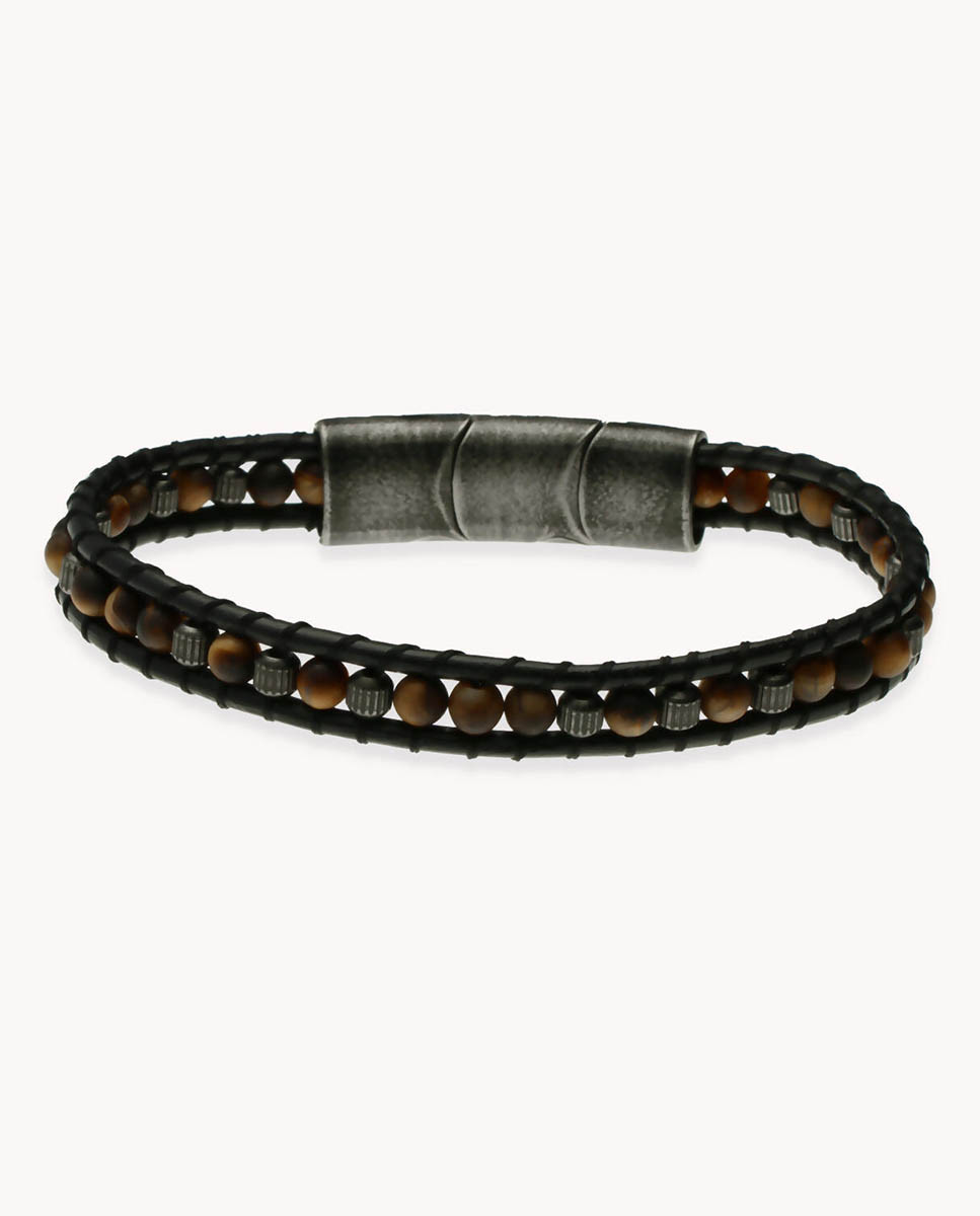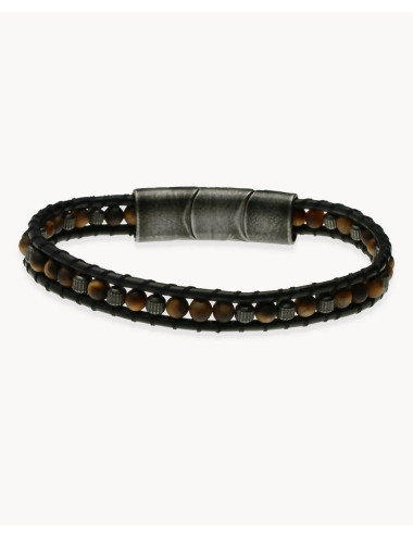 Pulsera piedras enlazadas marrones de acero inoxidable y cuero negro