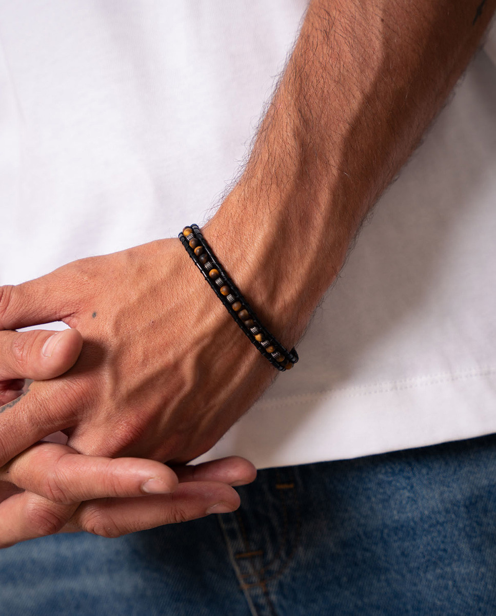 Pulsera de acero inoxidable y cuero negro con bolas de Ojo de Tigre mate de 4 mm de diámetro combinadas con entrepiezas de acero inoxidable, largo ajustable con pieza extraíble (20 cms y 21 cms) y cierre de imán.