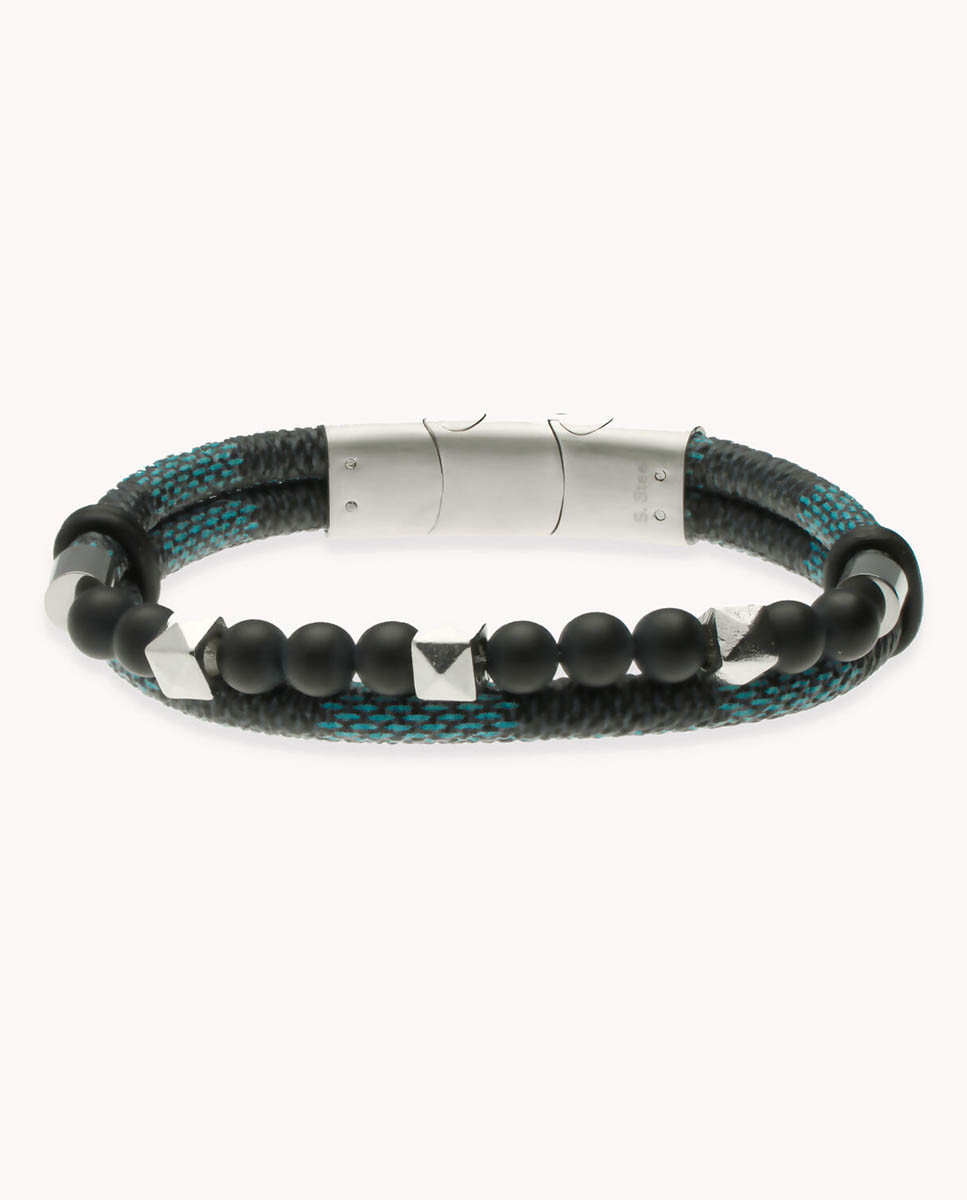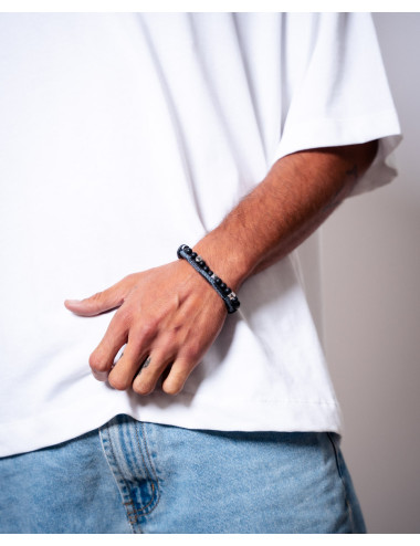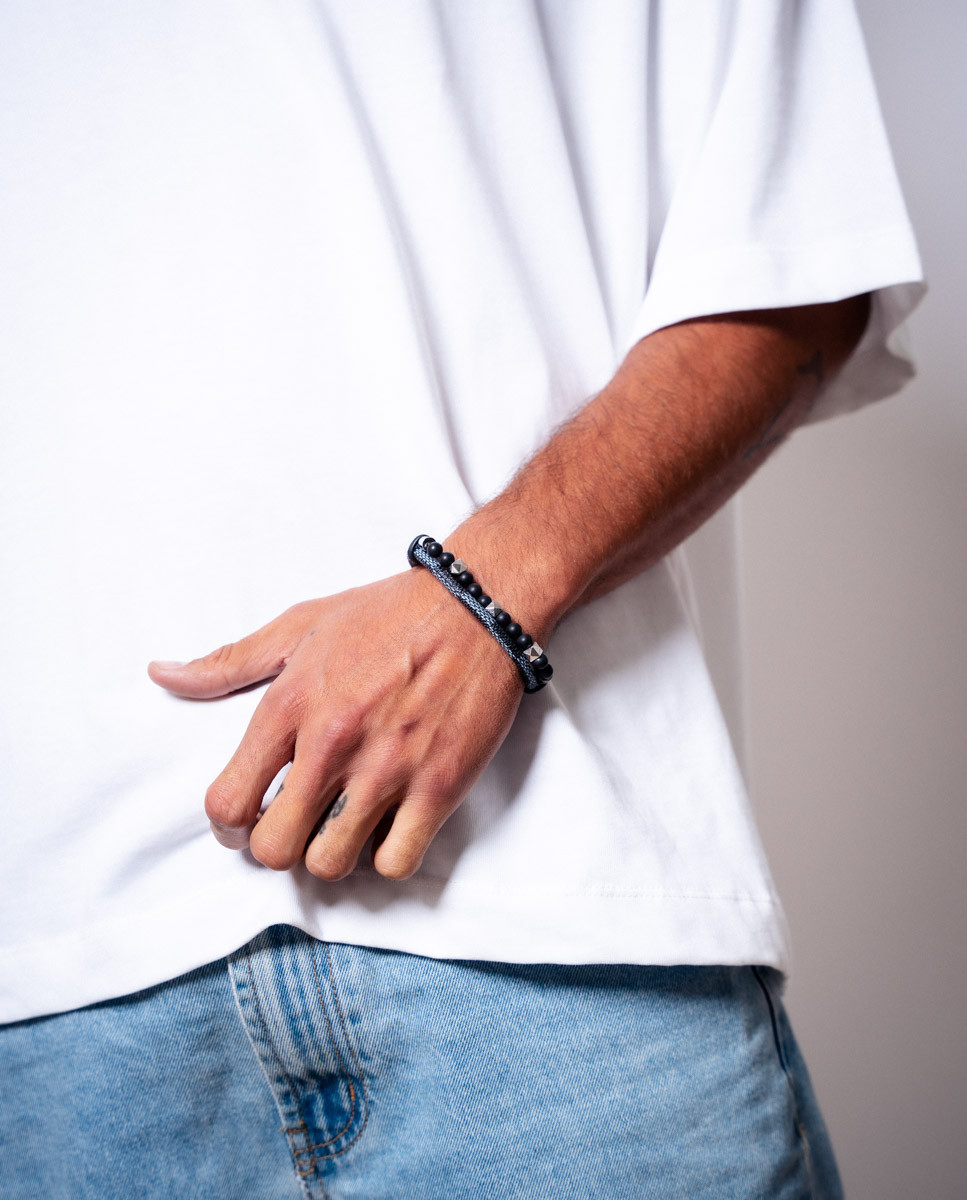 Pulsera piedras negras en cuero y cordón azul de acero inoxidable
