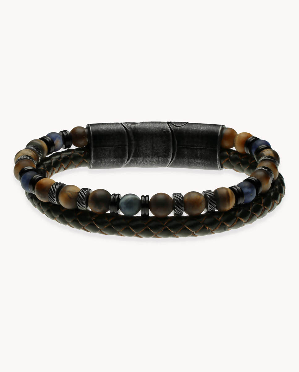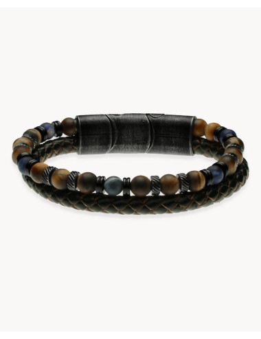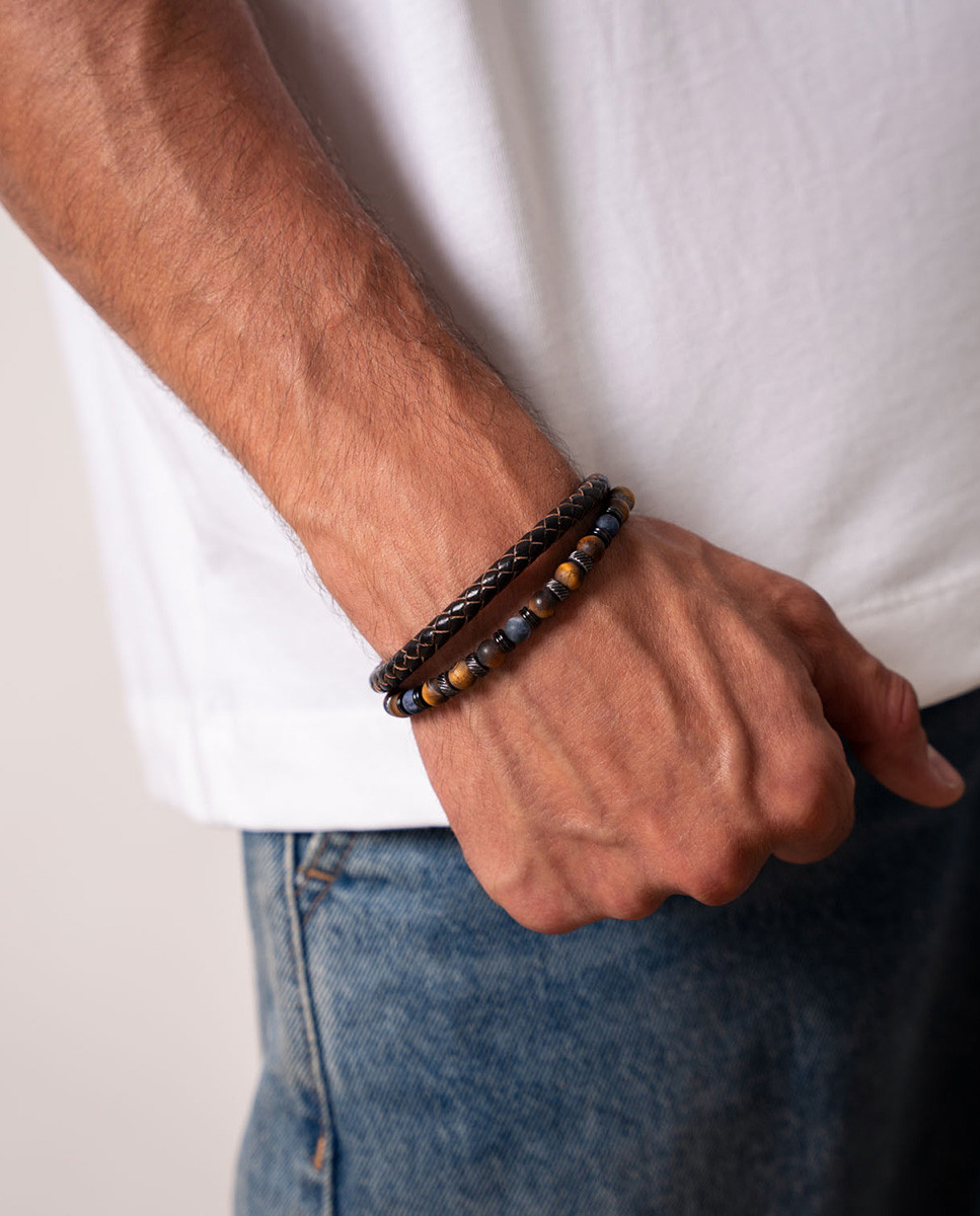 Pulsera de acero inoxidable doble compuesta por cuero trenzado tubular marrón de 6 mm de grosor, piedras de Ojo de tigre y Sodalita de 6 mm de diámetro combinadas con entrepiezas de acero inoxidable, largo ajustable con pieza extraíble (19,5 cms y 21 cms) y cierre de imán.