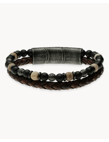 Pulsera sicilia piedras de acero inoxidable y cuero marrón