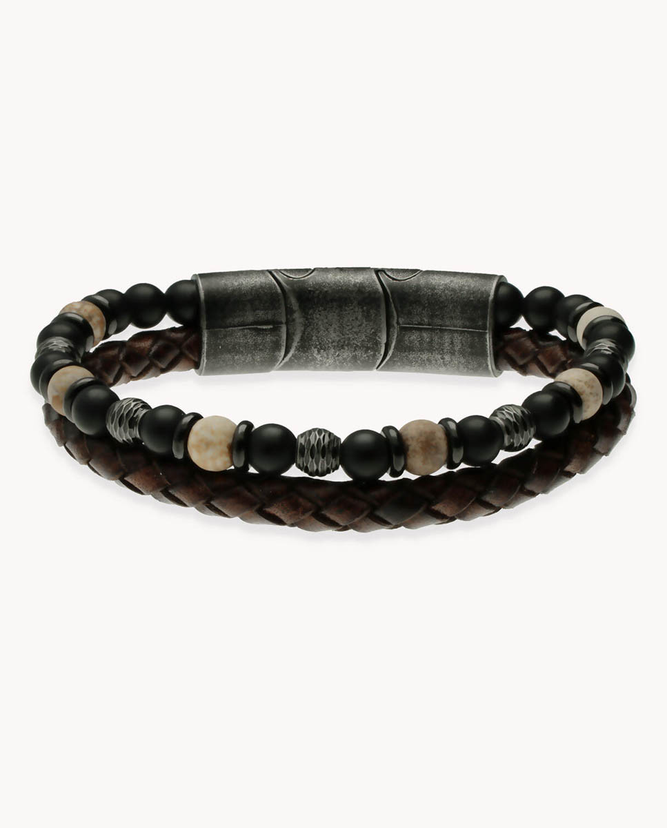 Pulsera de acero inoxidable doble compuesta por cuero trenzado tubular marrón de 6 mm de grosor, piedras de Ágata negra mate de 6 mm de diámetro combinadas con entrepiezas de acero inoxidable y bolas de madera de 6 mm de diámetro, largo ajustable con pieza extraíble (19,5 cms y 21 cms) y cierre de imán.