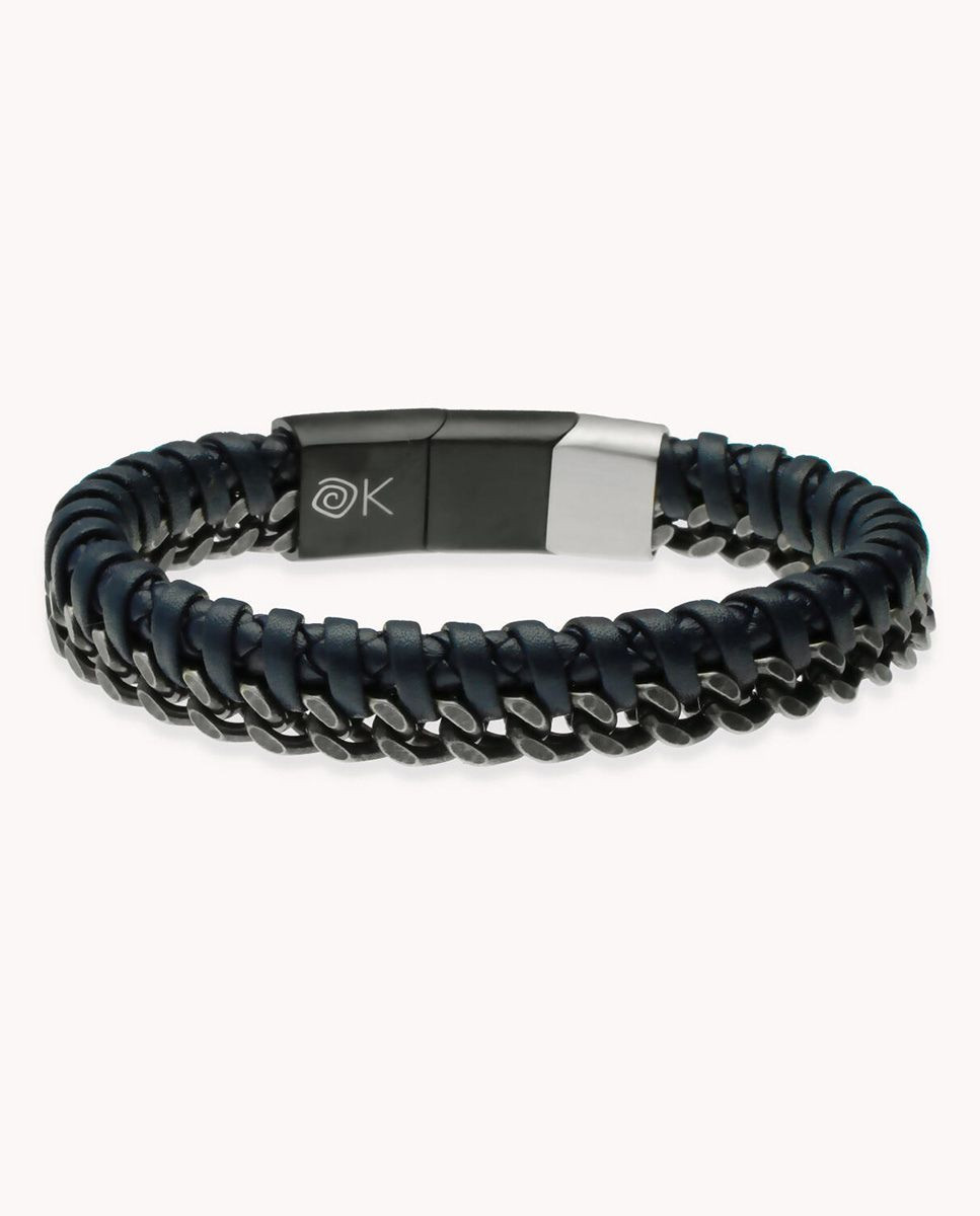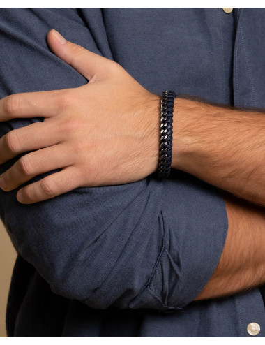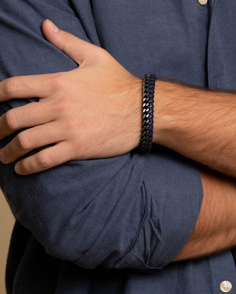 Pulsera de acero inoxidable con cuero azul trenzado combinado con cadena barbada en IP negro mate de 10 mm de ancho y 6 mm de grosor, largo de 20 cms a 21 cms y cierre de imán con una pieza extraíble.