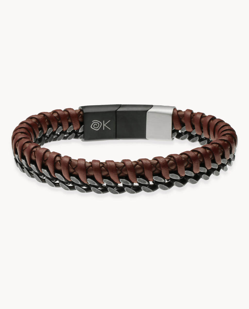 Pulsera de acero inoxidable con cuero marrón trenzado combinado con cadena barbada en IP negro mate de 10 mm de ancho y 6 mm de grosor, largo de 20 cms a 21 cms y cierre de imán con una pieza extraíble.