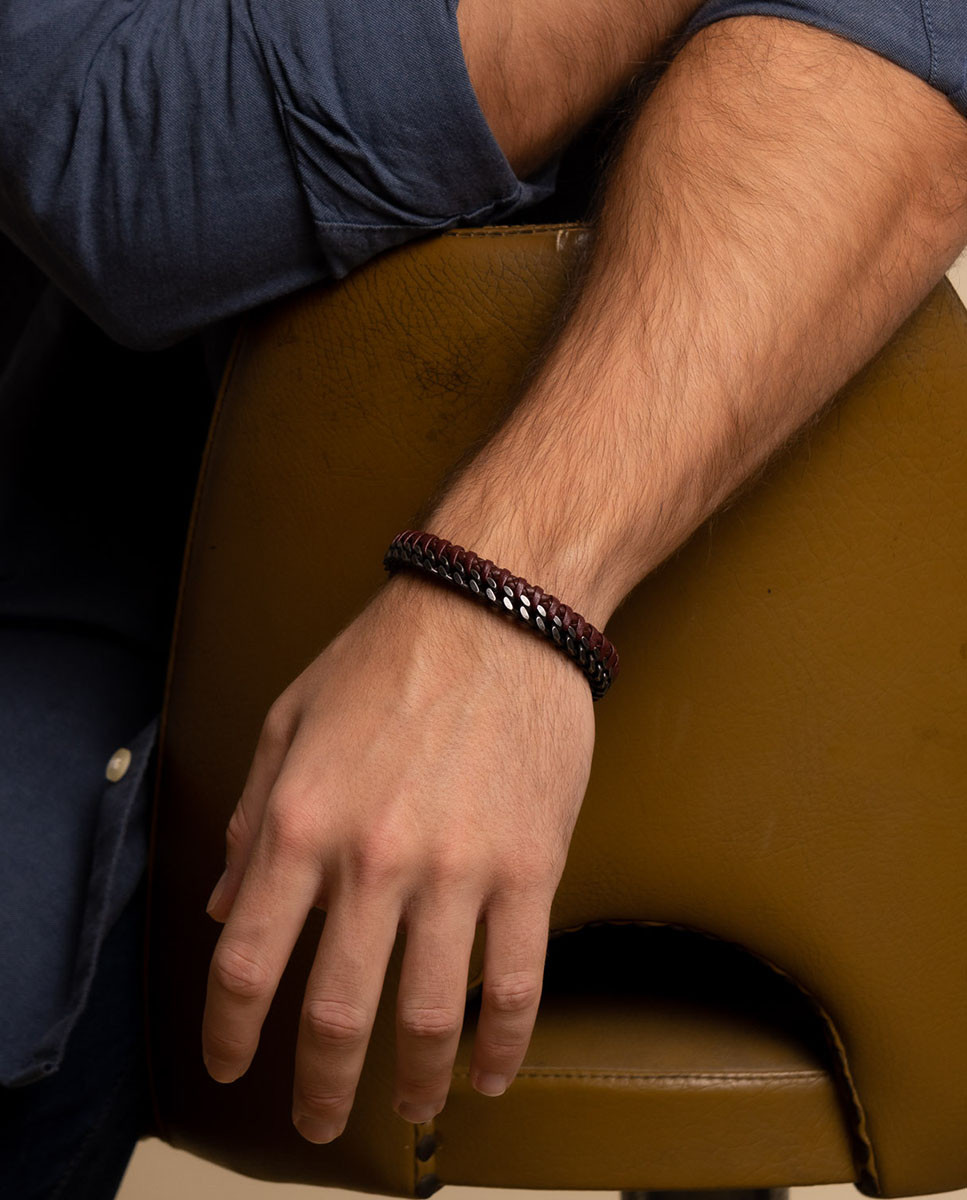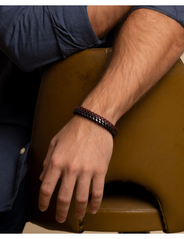 Pulsera trenza fuerza de cuero marrón vino y acero inoxidable